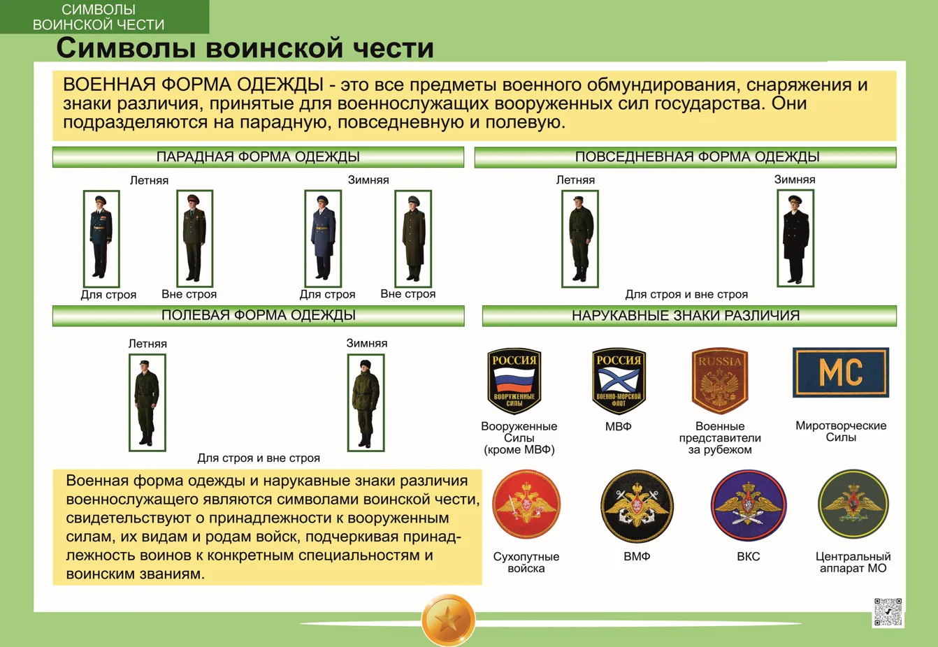 - «Символы воинской чести» — знакомит с государственной и воинской символикой, боевым знаменем и традициями российского воинства.