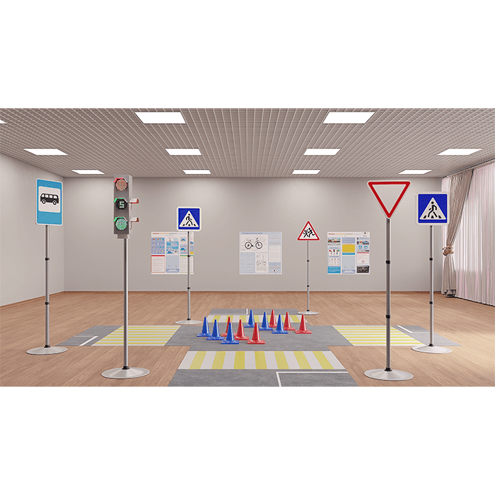 - Комплект дорожных знаков: 5 приоритетных знаков на стойках с устойчивым основанием (вес основания 3 кг).