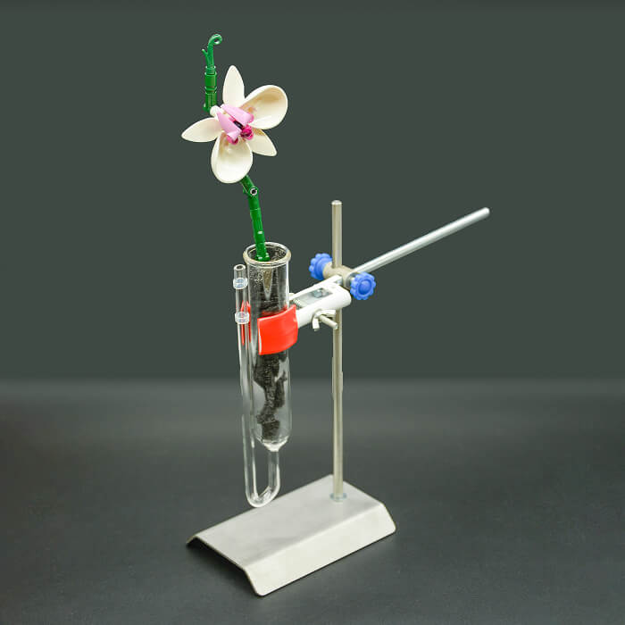 Описание. Прибор представляет собой две стеклянные трубки, соединенные между собой. Одна трубка прямая и узкая, другая – широкая, сужающаяся к низу. В широкой трубке размещают корневую систему растения. Растение закрепляют в приборе с помощью резиновой пробки, в которой дополнительно просверлен канал для того, чтобы было удобно вводить стебель растения в пробку. Узкая трубка предназначена для демонстрации изменения уровня воды в приборе в ходе опыта. При проведении опытов дополнительно используются: штатив лабораторный, проростки или небольшие растения с развитой корневой системой. Прибор упакован в картонную коробку с ложементом.