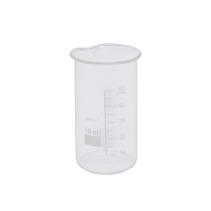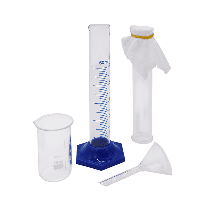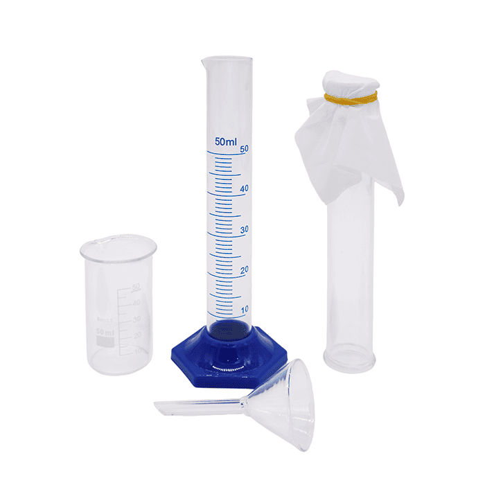- Цилиндр стеклянный (50 мл): оснащен мерной шкалой и устойчивой подставкой (высота — 180 мм, диаметр — 25 мм).