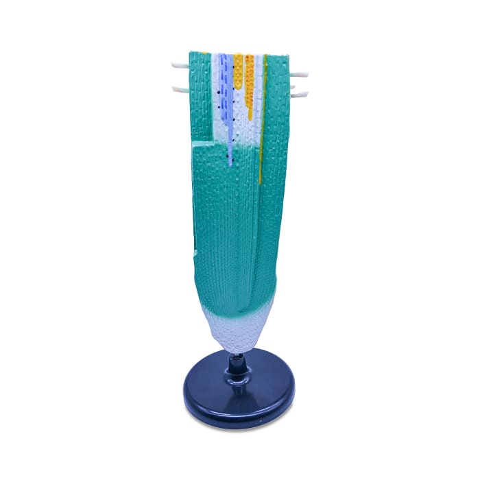 Предназначена для демонстрации на уроках биологии по разделу "Растения", теме "Корень". Модель неразборная, изготовлена из пластмассы, раскрашена и установлена на подставке. На модели цветом выделены следующие детали строения корня: Зона проведения; Проводящие пучки; Зона всасывания; Зона роста; Зона деления; Корневые волоски; Корневой чехлик.