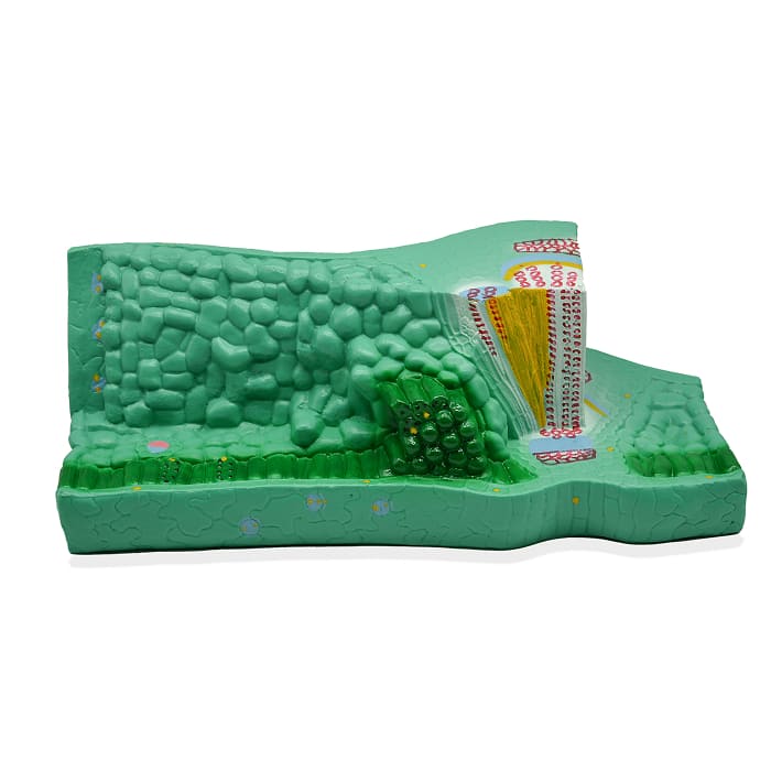 Предназначена для демонстрации на уроках биологии по разделу "Растения", теме "Побег", а также по разделу "Общая биология", теме "Фотосинтез". Позволяет демонстрировать лист в разрезе и показать его строение: кожицу с устьями, губчатая и столбчатая ткань мякоти листа, проводящие пучки. Модель неразборная, изготовлена из пластмассы, раскрашена.