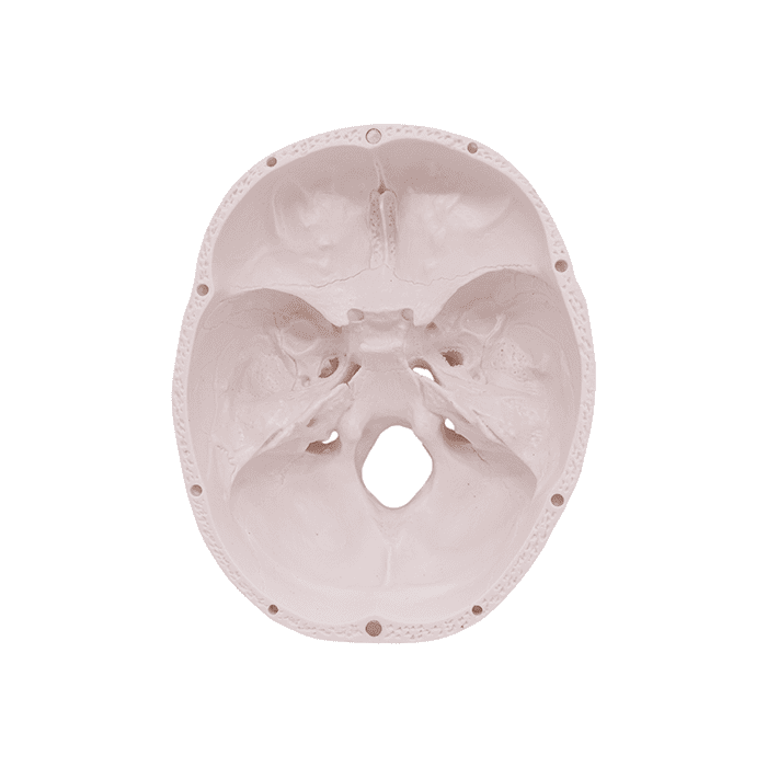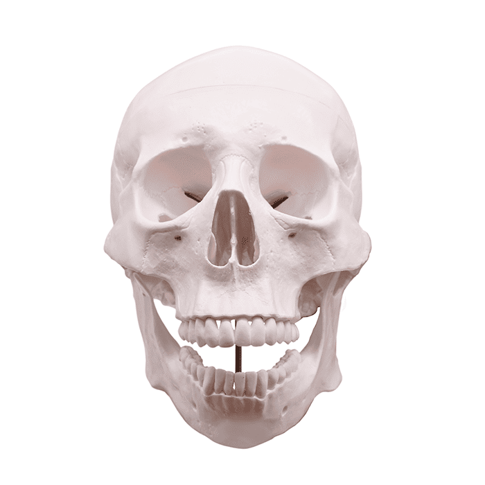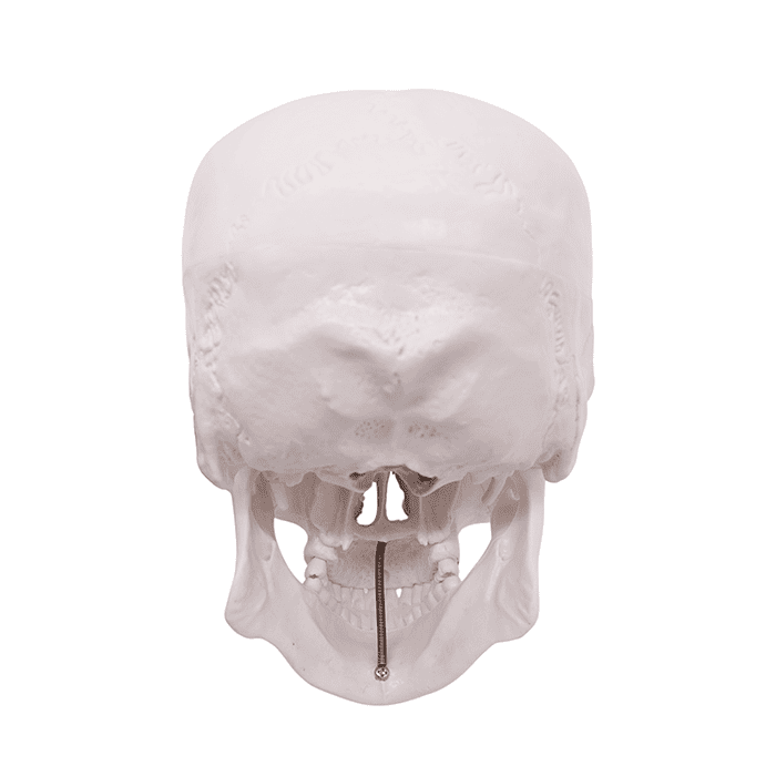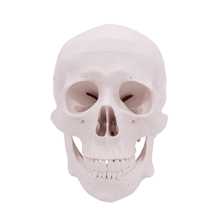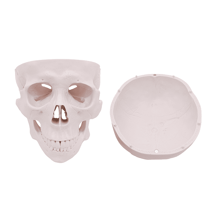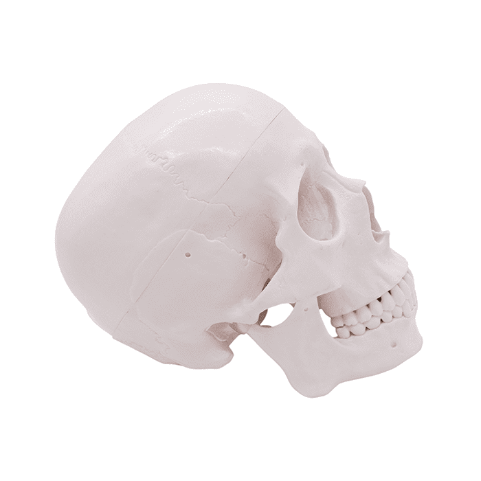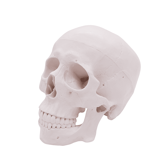 - Изучаемые структуры: Несмотря на компактность, модель детализирована и позволяет рассмотреть границы лицевого и мозгового отделов, включая: лобную, теменные, височные, затылочную и клиновидную кости, а также верхнюю и нижнюю челюсти, скулы и носовые кости.
