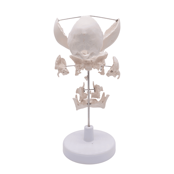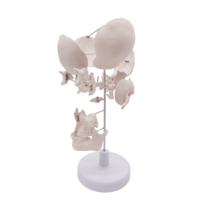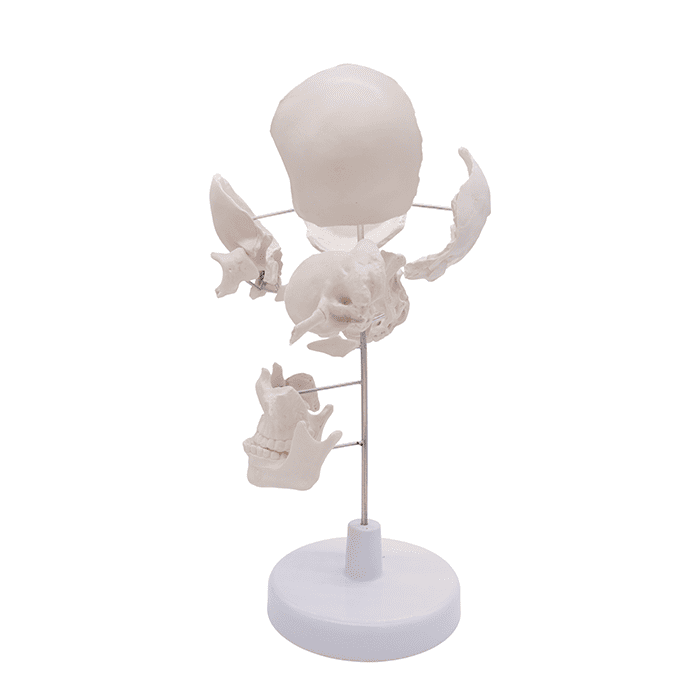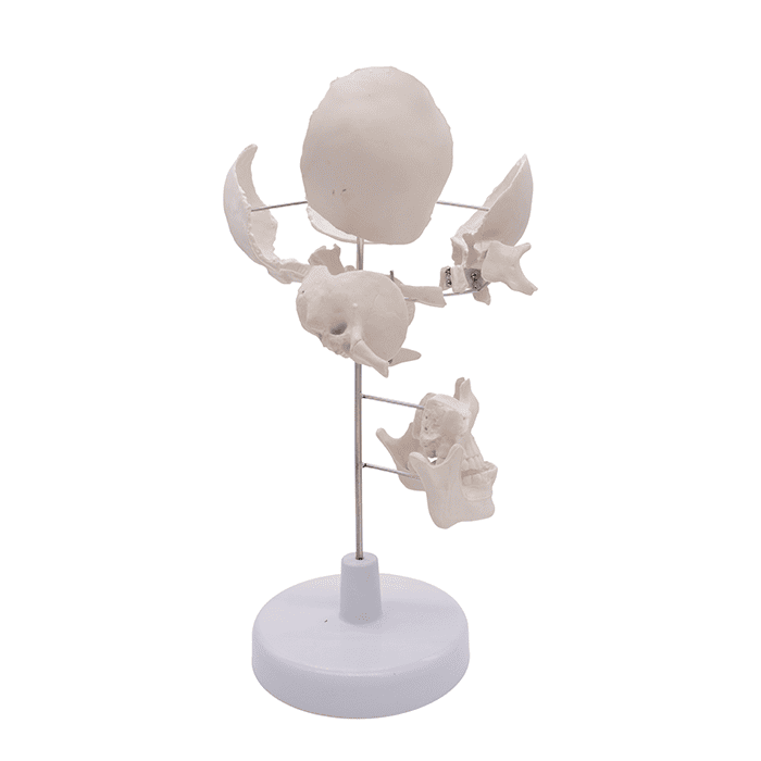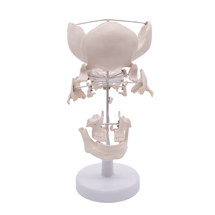 Модель включает полный набор костей лицевого и мозгового отделов:- парные кости: теменные, височные, скуловые, носовые, слезные, а также верхние челюсти с раковинами;