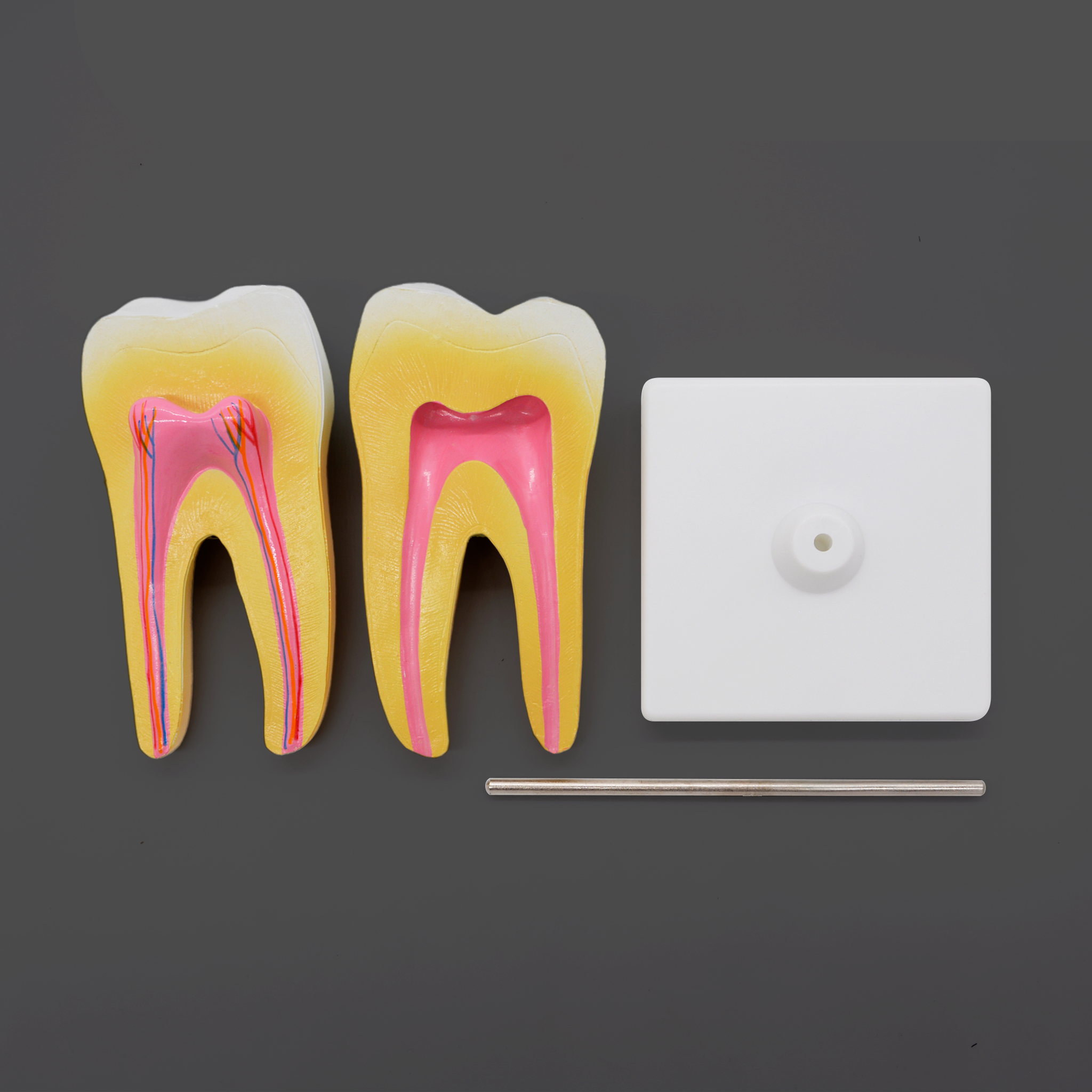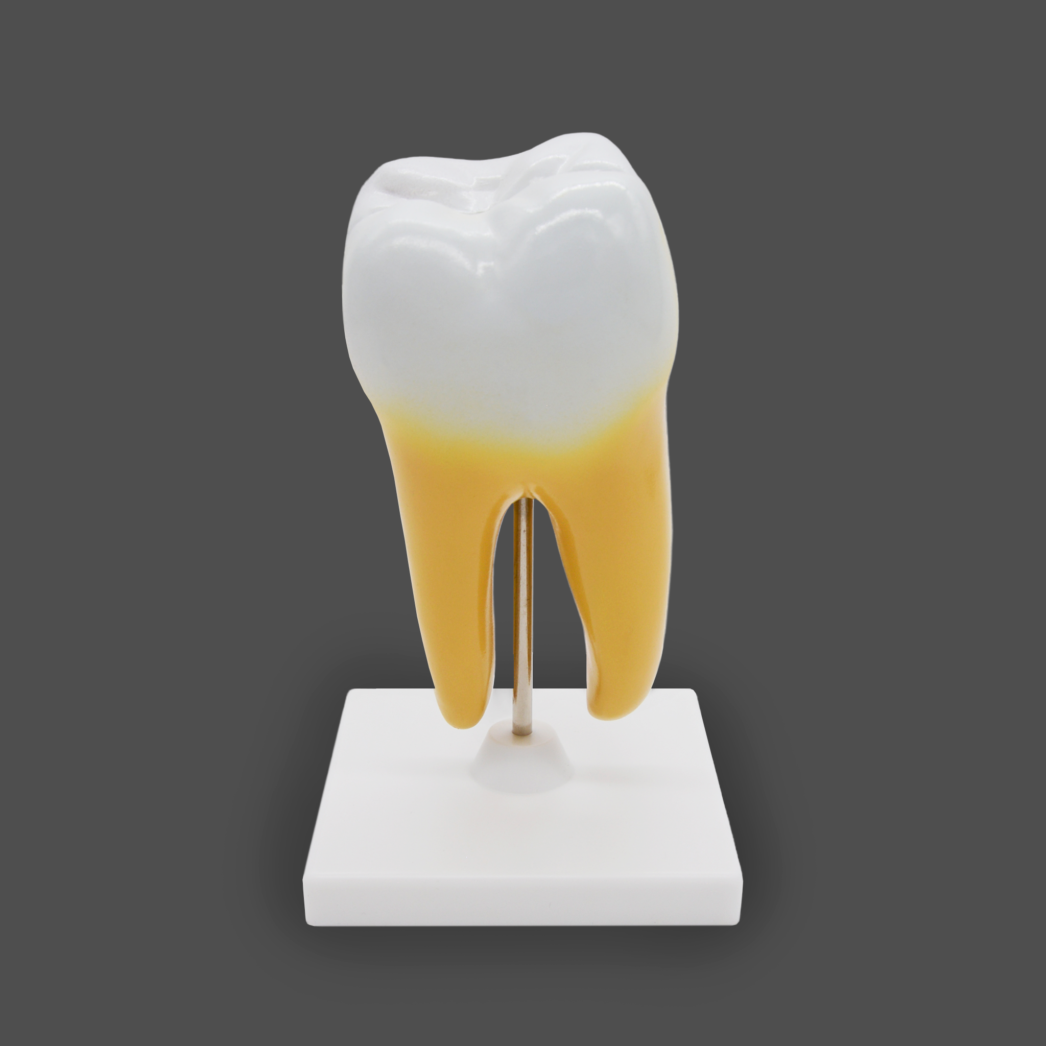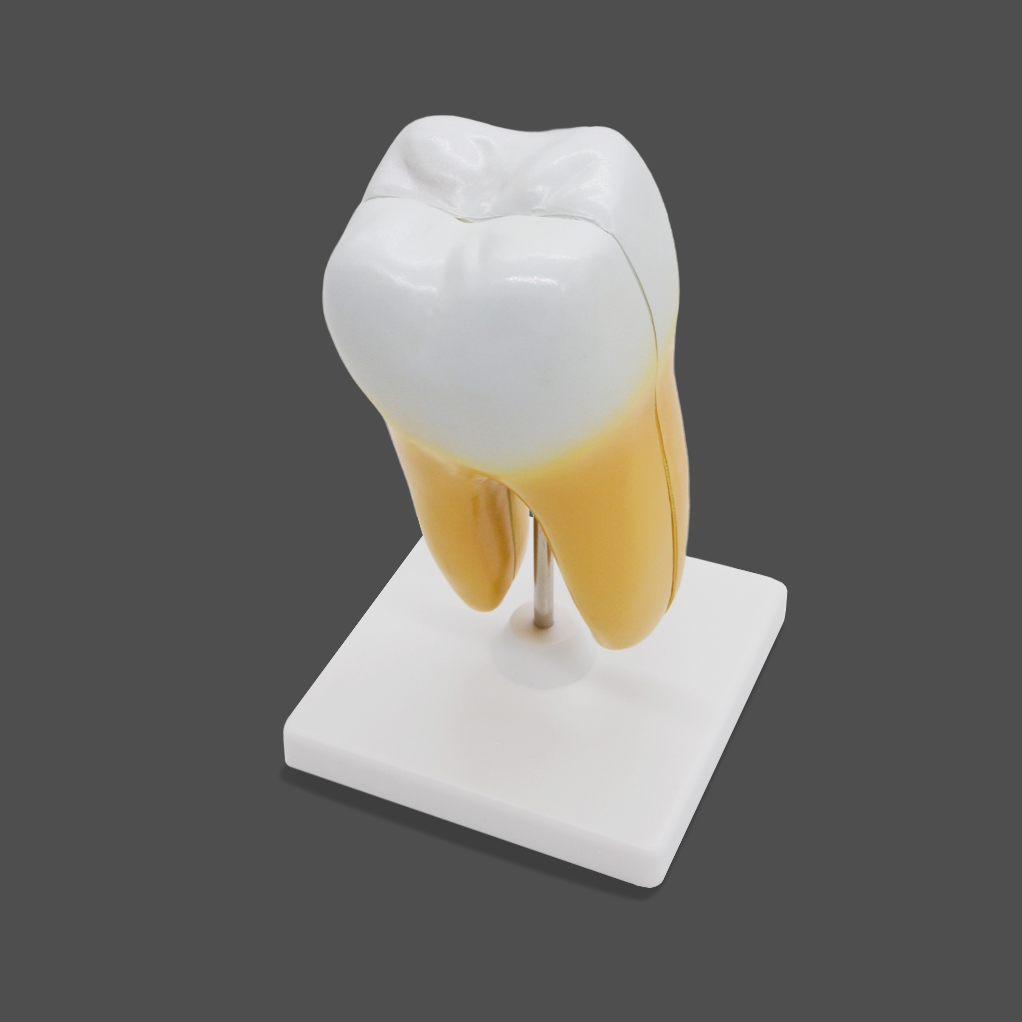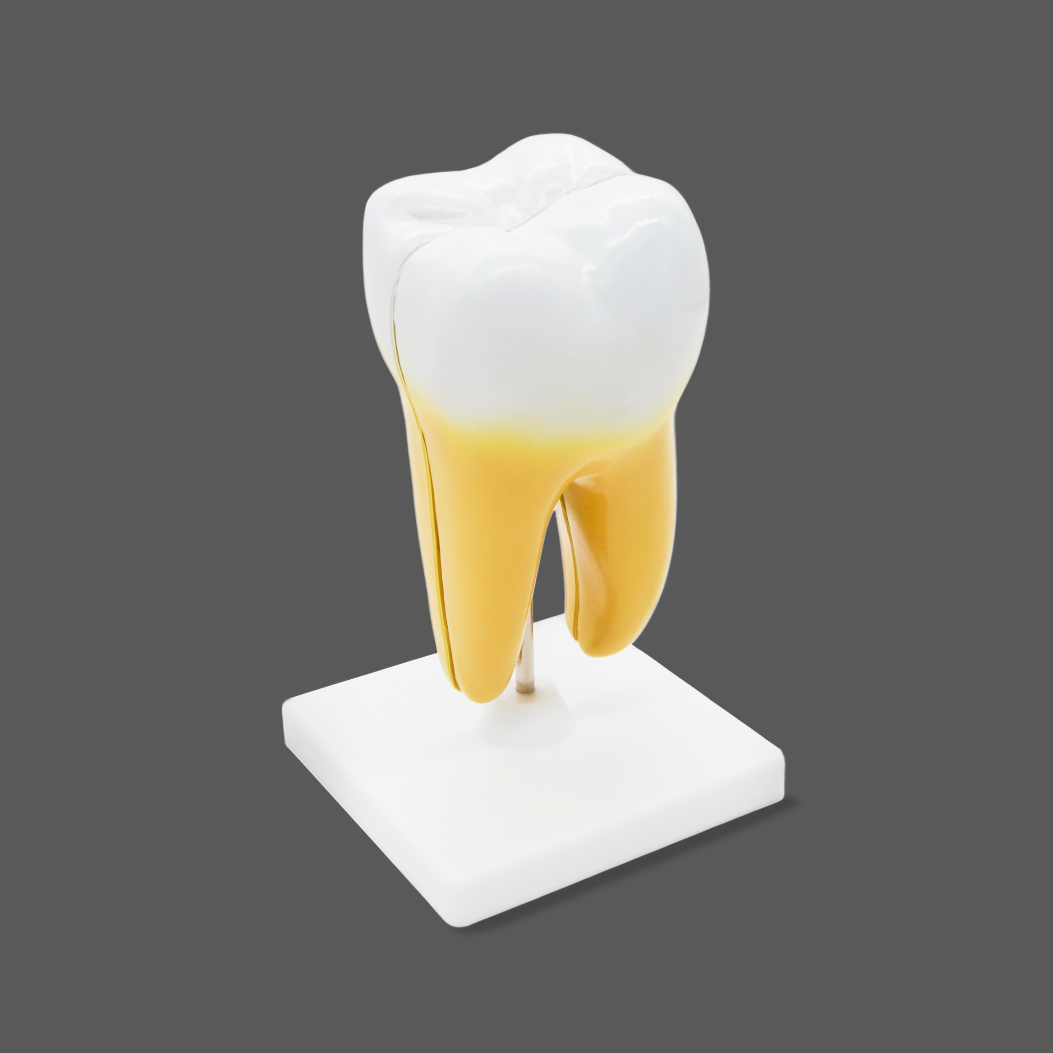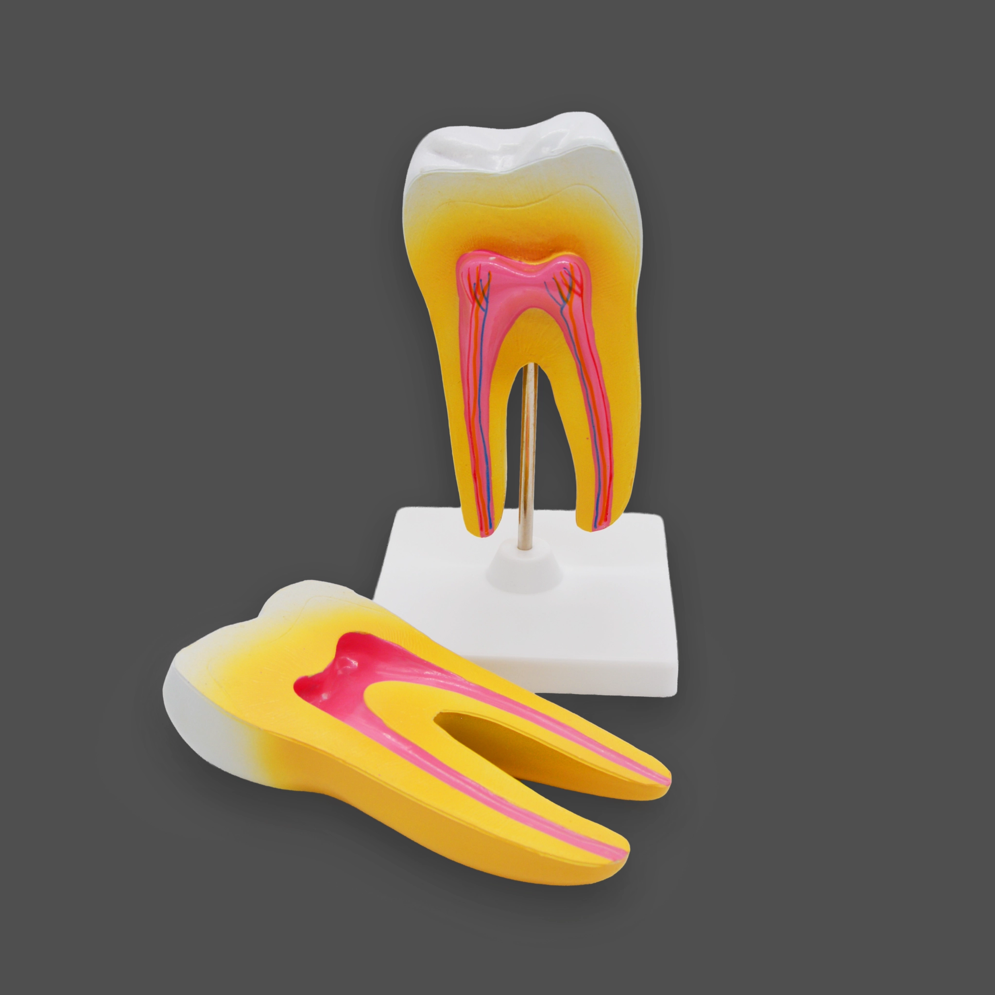 Благодаря увеличенному масштабу и разборной конструкции, учащиеся могут изучить не только внешнюю форму, но и сложную внутреннюю структуру моляра. Для максимальной эффективности обучения ключевые анатомические элементы выделены контрастными и естественными цветами:- Внешнее строение: Коронка, шейка и корни зуба.