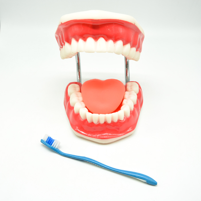 Модель изображает увеличенное строение челюстей человека, изготовлена из пластмассы и снабжена подвижными металлическими креплениями. Модель позволяет демонстрировать виды зубов и их расположение в ротовой полости. В комплект входит зубная щетка.