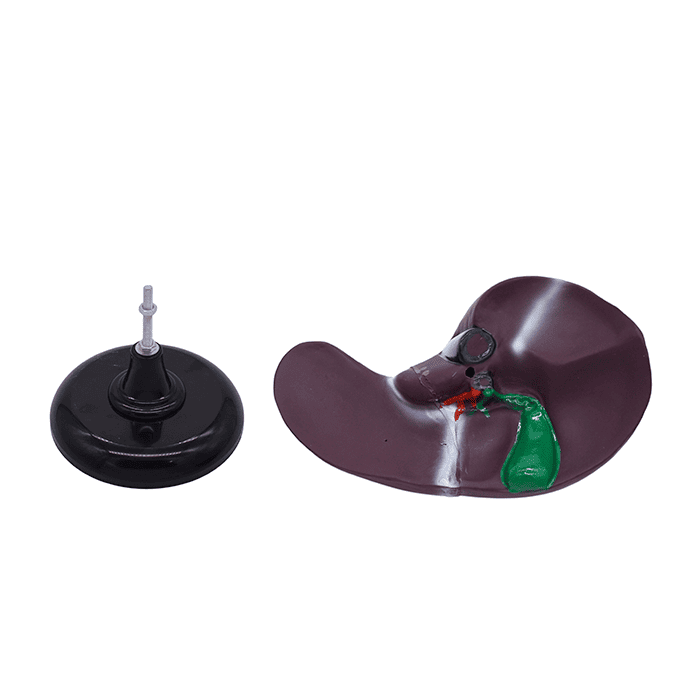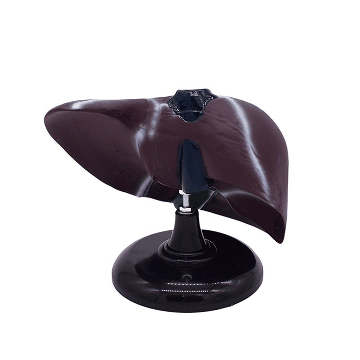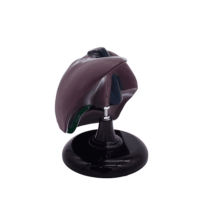 - Модель представляет собой уменьшенную копию печени человека, установленную на демонстрационную стойку. Материал изготовления — ударопрочная пластмасса. Окрашивание имитирует натуральные ткани органа.