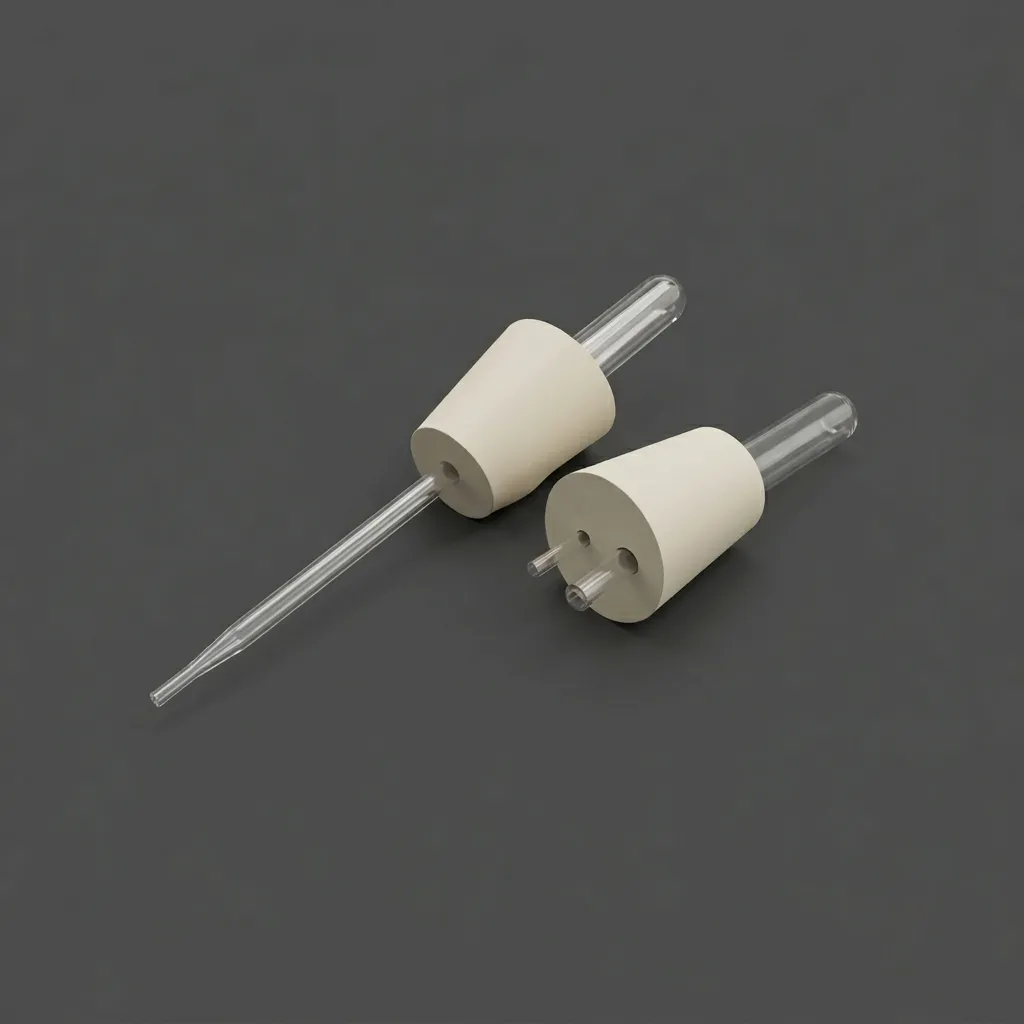 3. Резиновые пробки с вставленными пипетками/трубками (2 шт.) — герметизируют колбы, предотвращая утечку газов, но позволяют вводить дополнительные реагенты (например, из пипетки). Одна пробка с газоотводной трубкой.