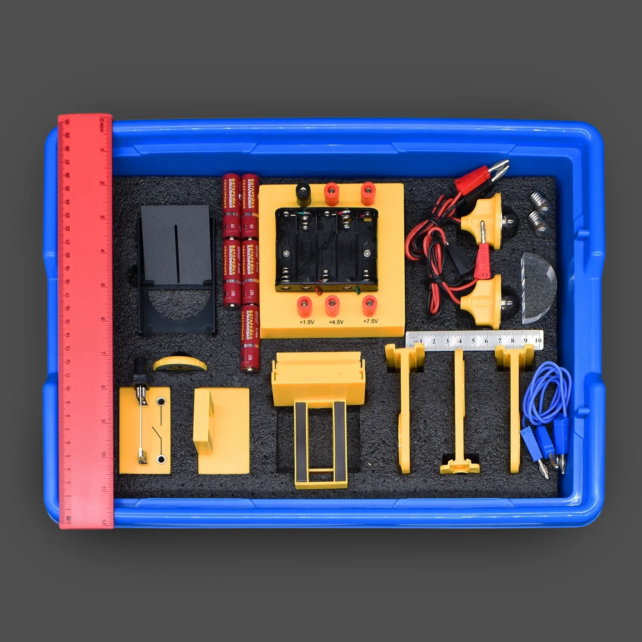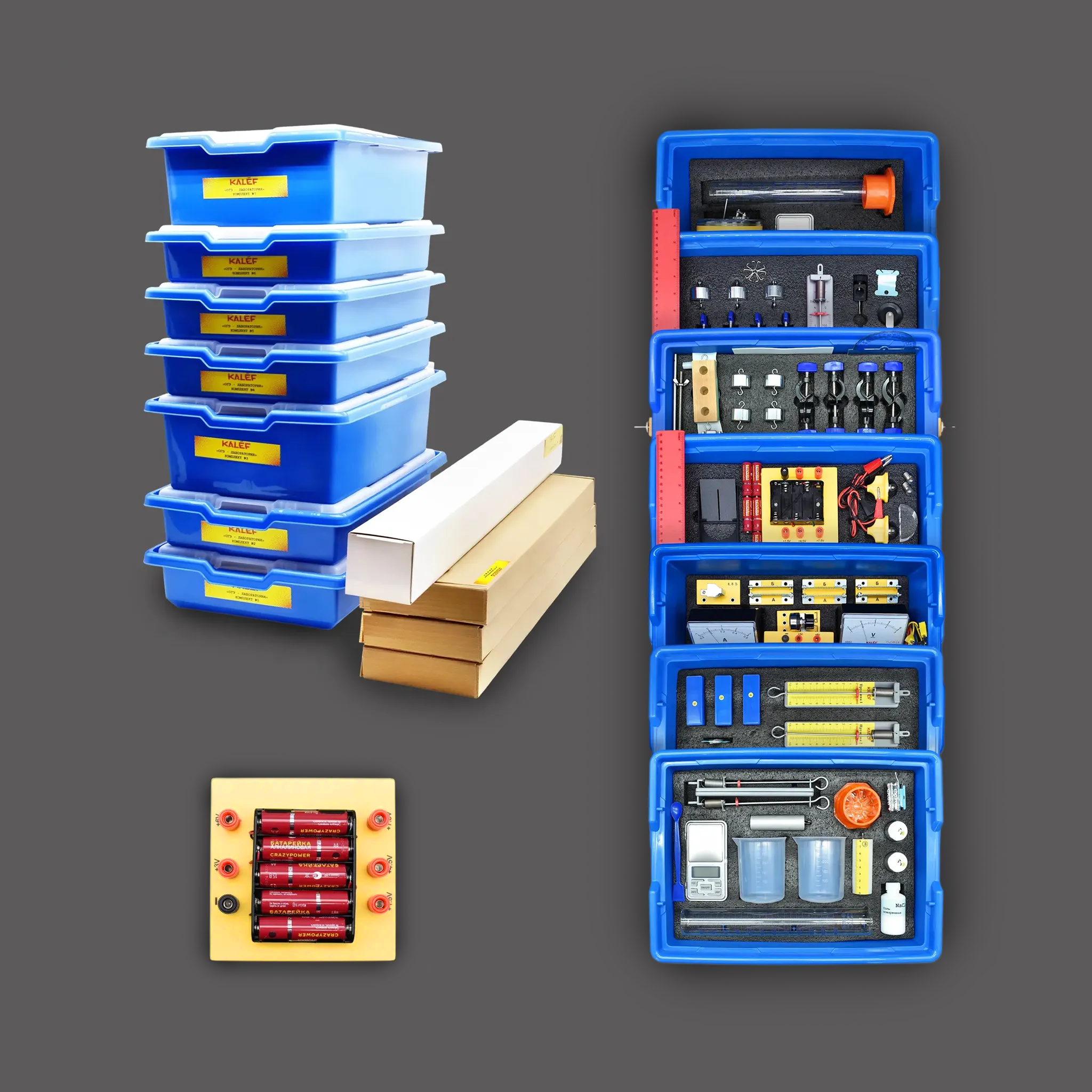 Набор предназначен для выполнения экспериментальных заданий ОГЭ по физике в соответствии со Спецификацией контрольных измерительных материалов, утверждённой ФГБНУ «ФИПИ». Состоит из 7 тематических комплектов, охватывающих ключевые разделы школьного курса физики (механика, электричество, оптика, тепловые явления и др.).