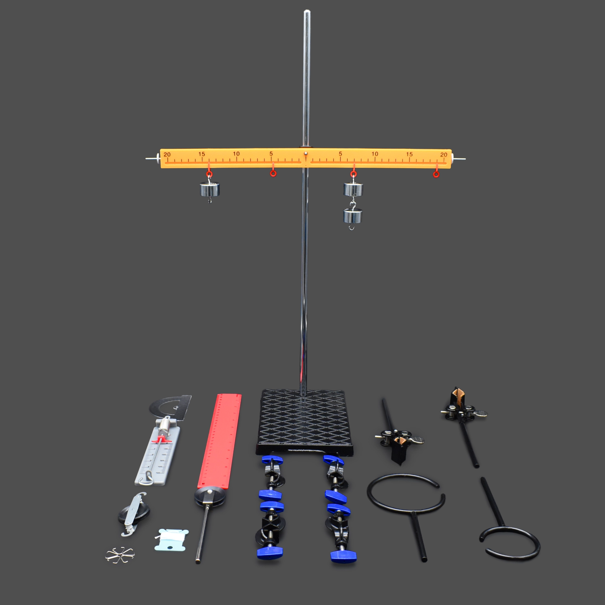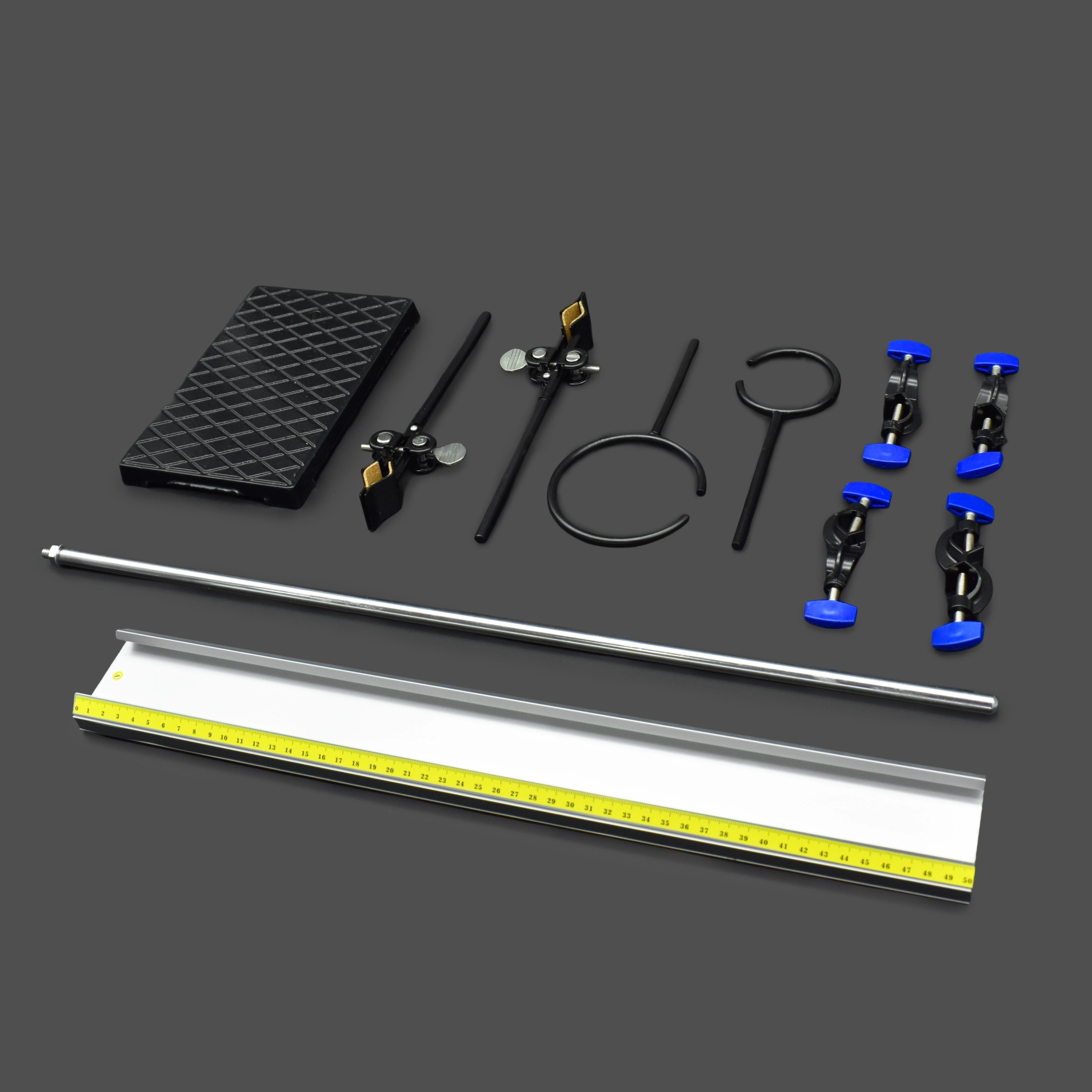 - Состав: штатив лабораторный с держателями, направляющая рейка длиной 500мм с двумя типами покрытий (А и Б), линейка (300 мм) и транспортир, паспорт.