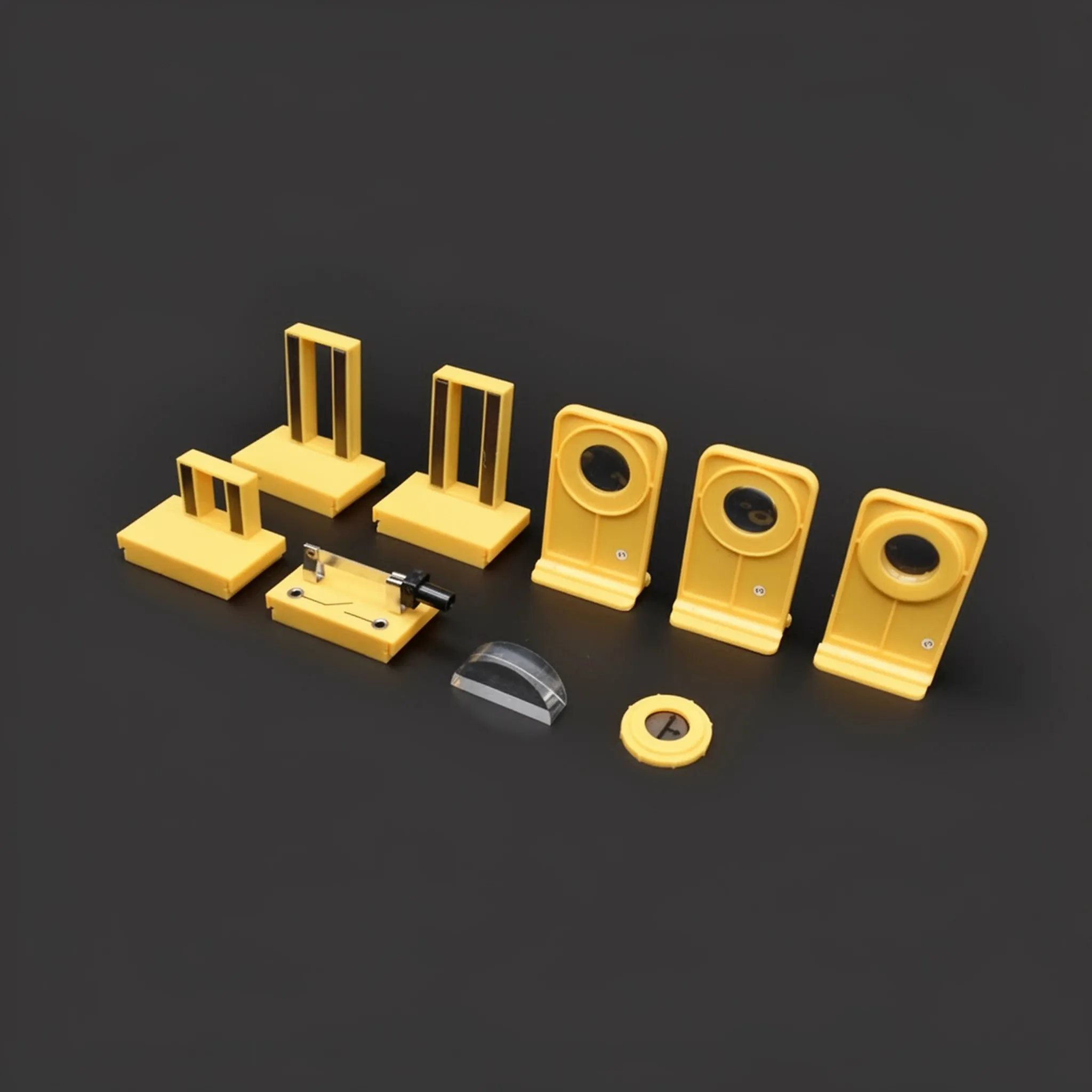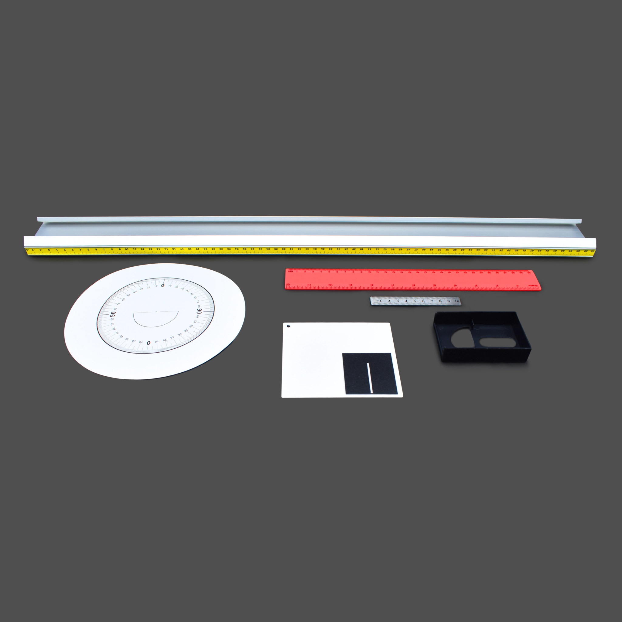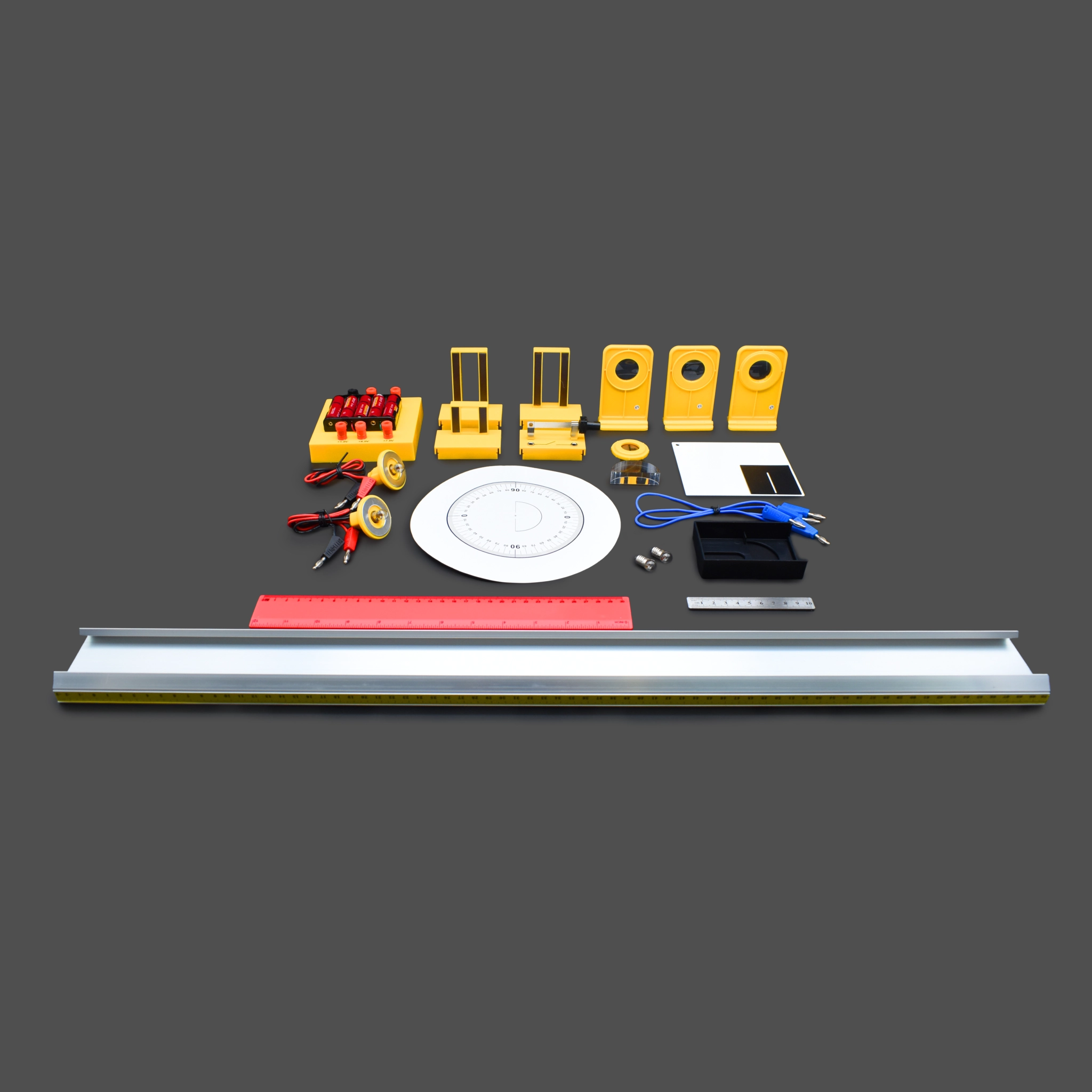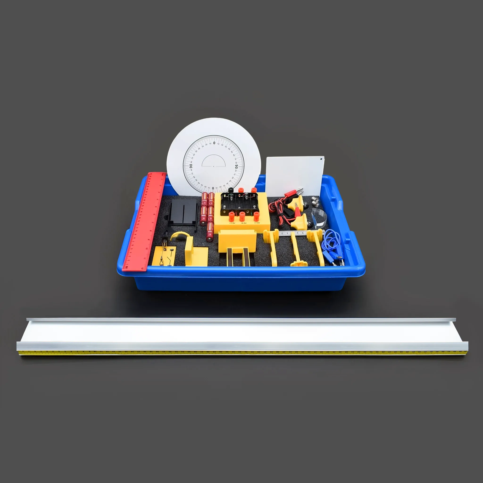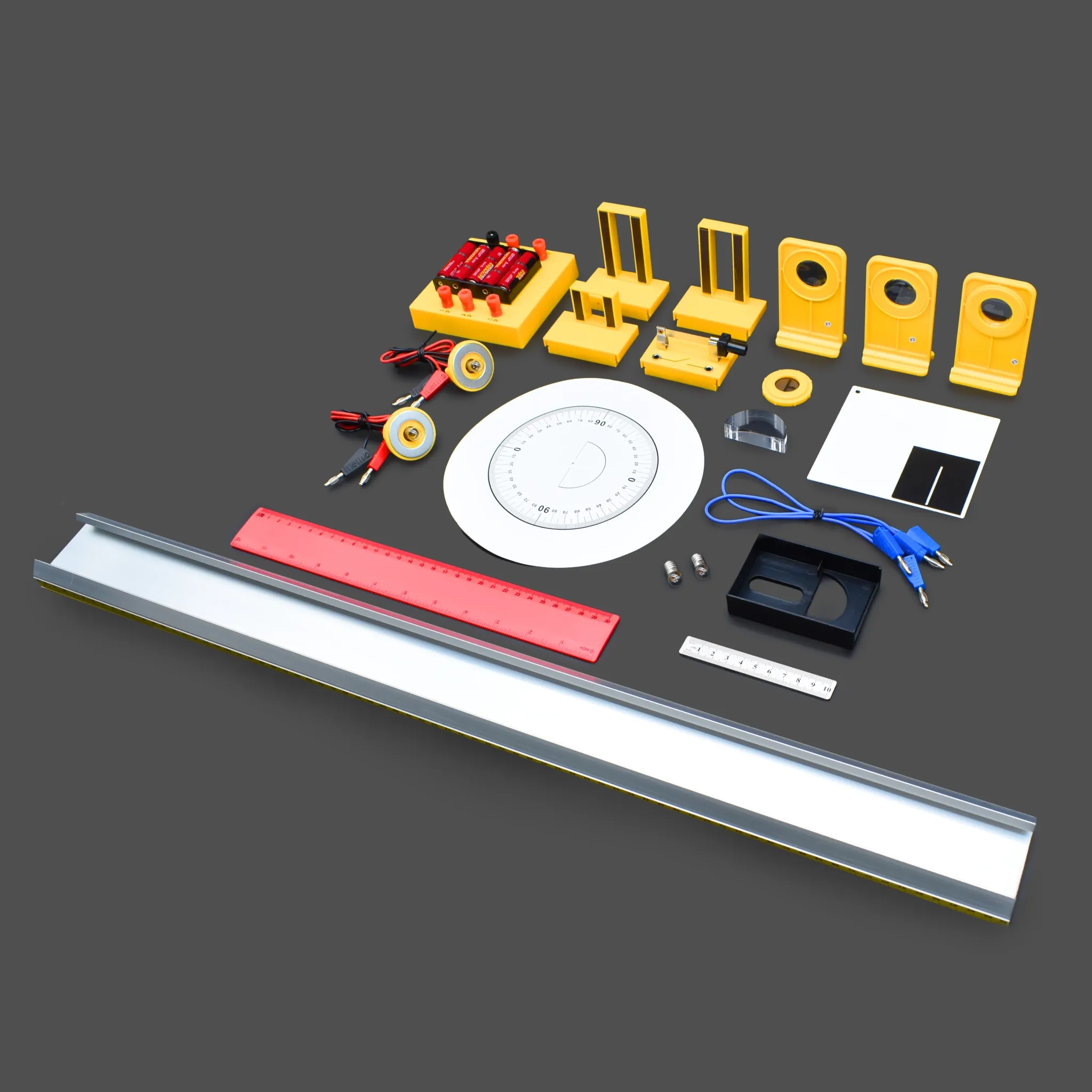 - Состав: батарейный блок (1,5–7,5 В), оптическая скамья (длина ≥700 мм), 2 типа осветителей (универсальный и точечный), экран, магнитный держатель, планшет с круговым транспортиром, паспорт.