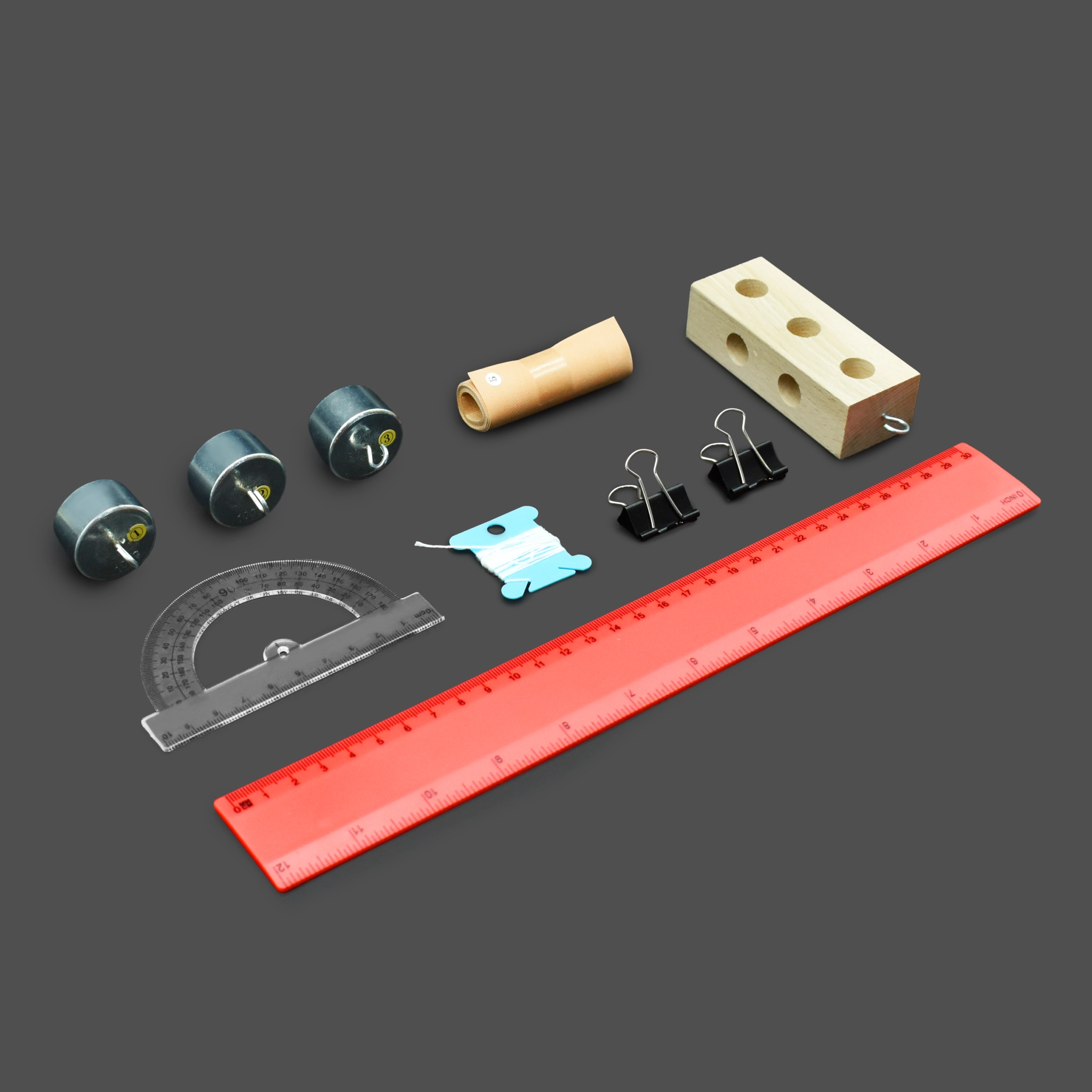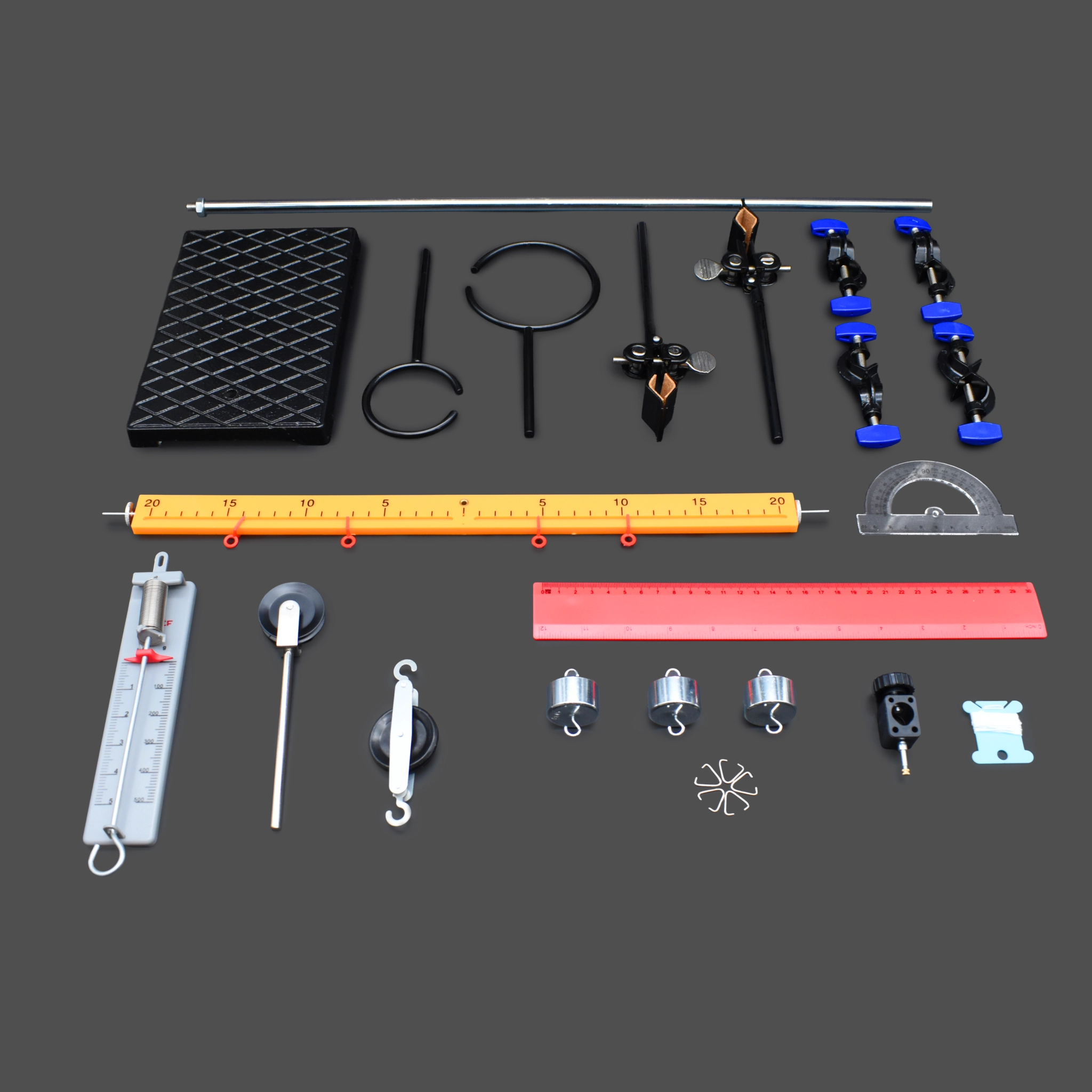 - Состав: лабораторный штатив, блок подвижный, блок неподвижный, нить кордовая, 3 груза по 100±2 г, линейка (300 мм), транспортир, паспорт.