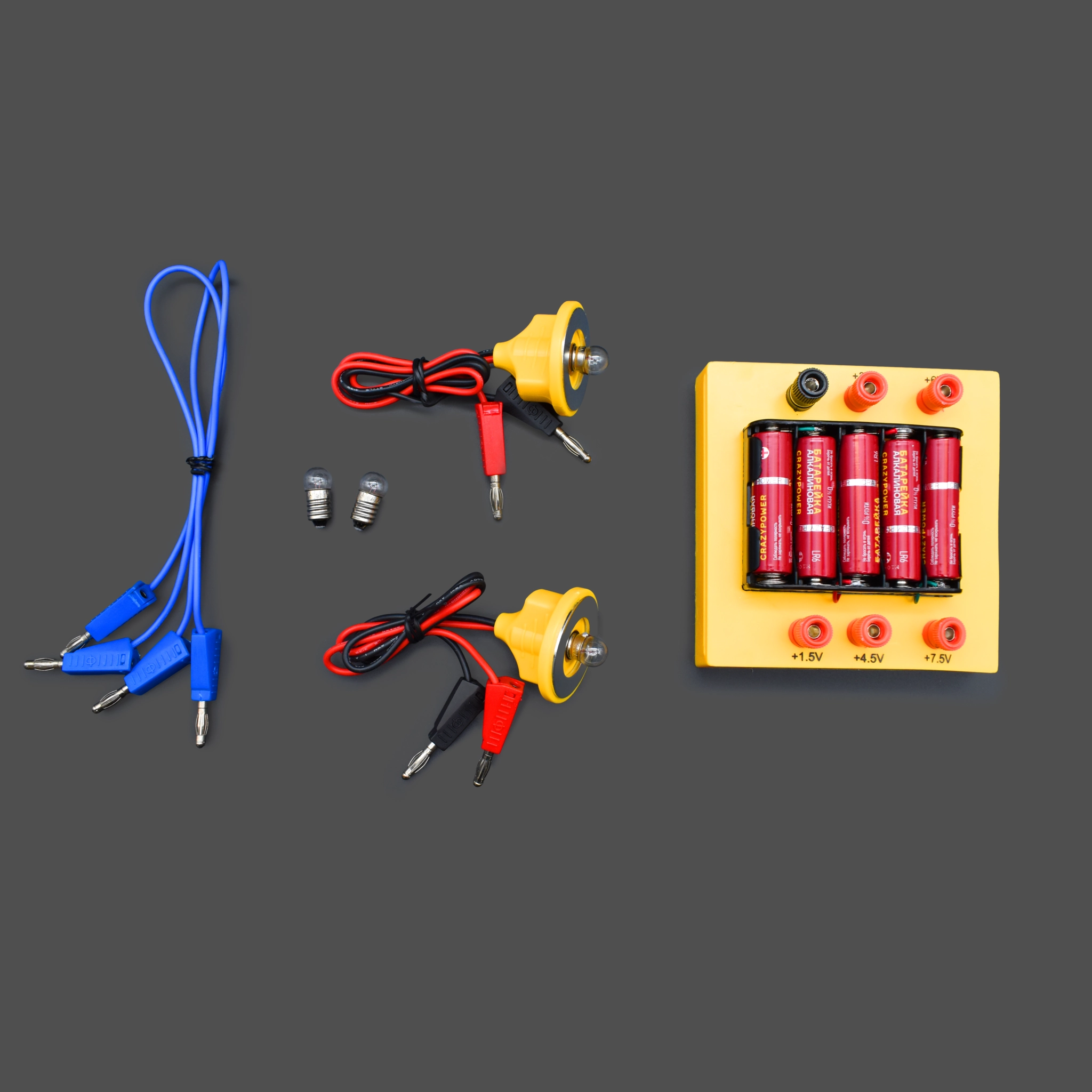 - Светотехника и коммутация: лампа 4,8 В (0,5 А), набор проволочных сопротивлений из различных материалов, 10 проводов, ключ, паспорт.