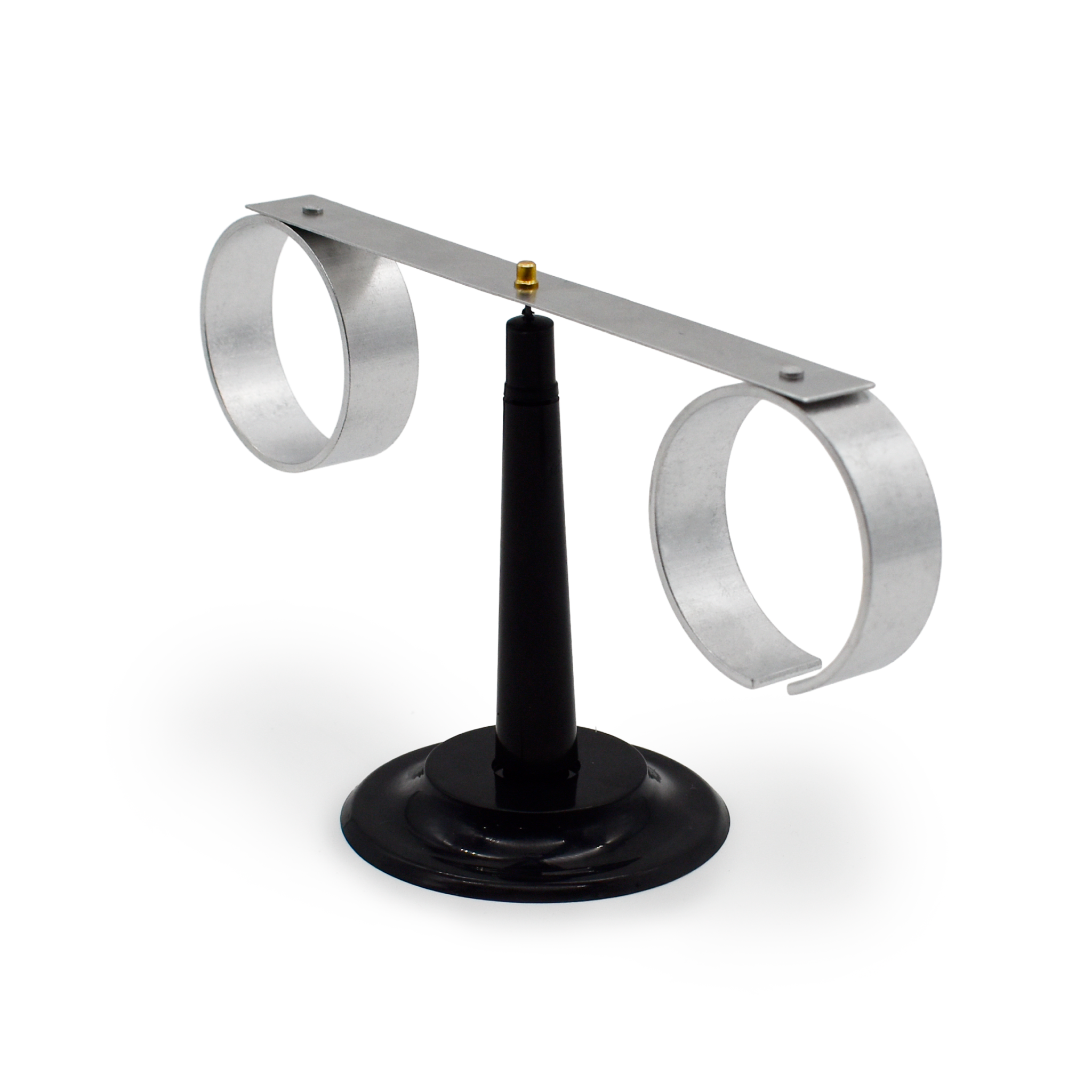 1. Металлическая планка-коромысло — основа конструкции, на которой закреплены кольца. Два алюминиевых кольца, одно сплошное (без разрывов) демонстрирует возникновение индукционного тока и его воздействие. Второе с прорезью в 7 мм служит для сравнения, показывая, что в разомкнутом контуре индукционный ток не возникает.