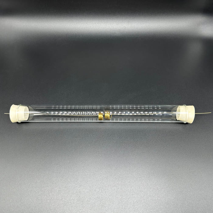 Газоразрядная трубка изготовлена из прозрачного стекла в форме полого цилиндра, имеющего одинаковый диаметр по всей своей длине.