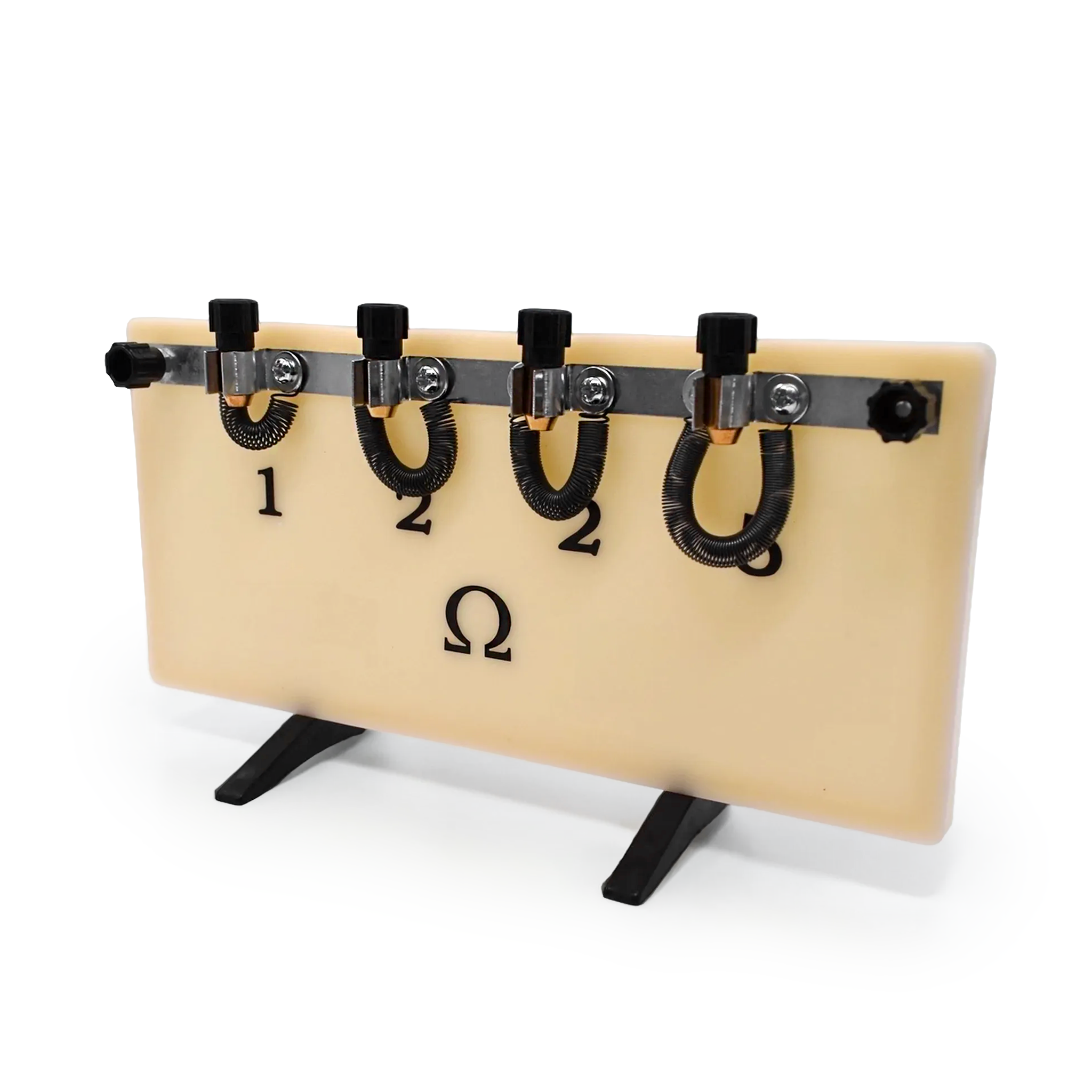Магазин резисторов смонтирован на панели, вдоль верхнего края которой укреплены пять латунных скоб, изолированных друг от друга и соединяемых латунными штепселями с головками из пластмассы. На крайних скобах установлены два зажима для включения магазина в цепь. К каждым двум соседним скобам присоединены концы проволочных сопротивлений в виде спиралей из константановой проволоки. Сопротивления спиралей обозначены цифрами на панели.