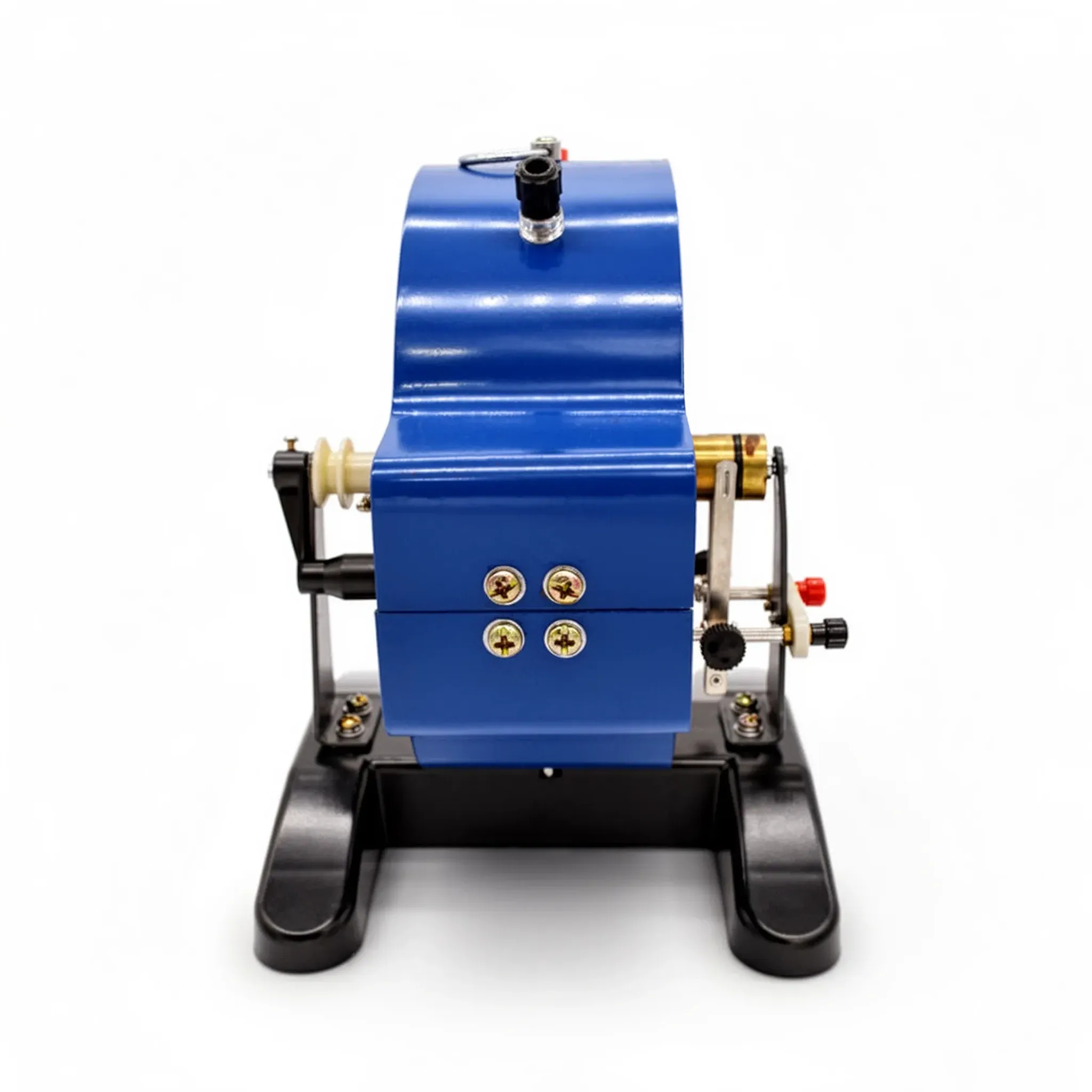 Внутри каждой секции видны катушки с обмоткой — это электромагниты, создающие магнитное поле. В центре конструкции расположен якорь (ротор) с валом, который может вращаться. На валу закреплена ручка или элемент для ручного запуска. Вся конструкция закреплена на устойчивой подставке чёрного цвета, обеспечивающей фиксацию модели на поверхности.