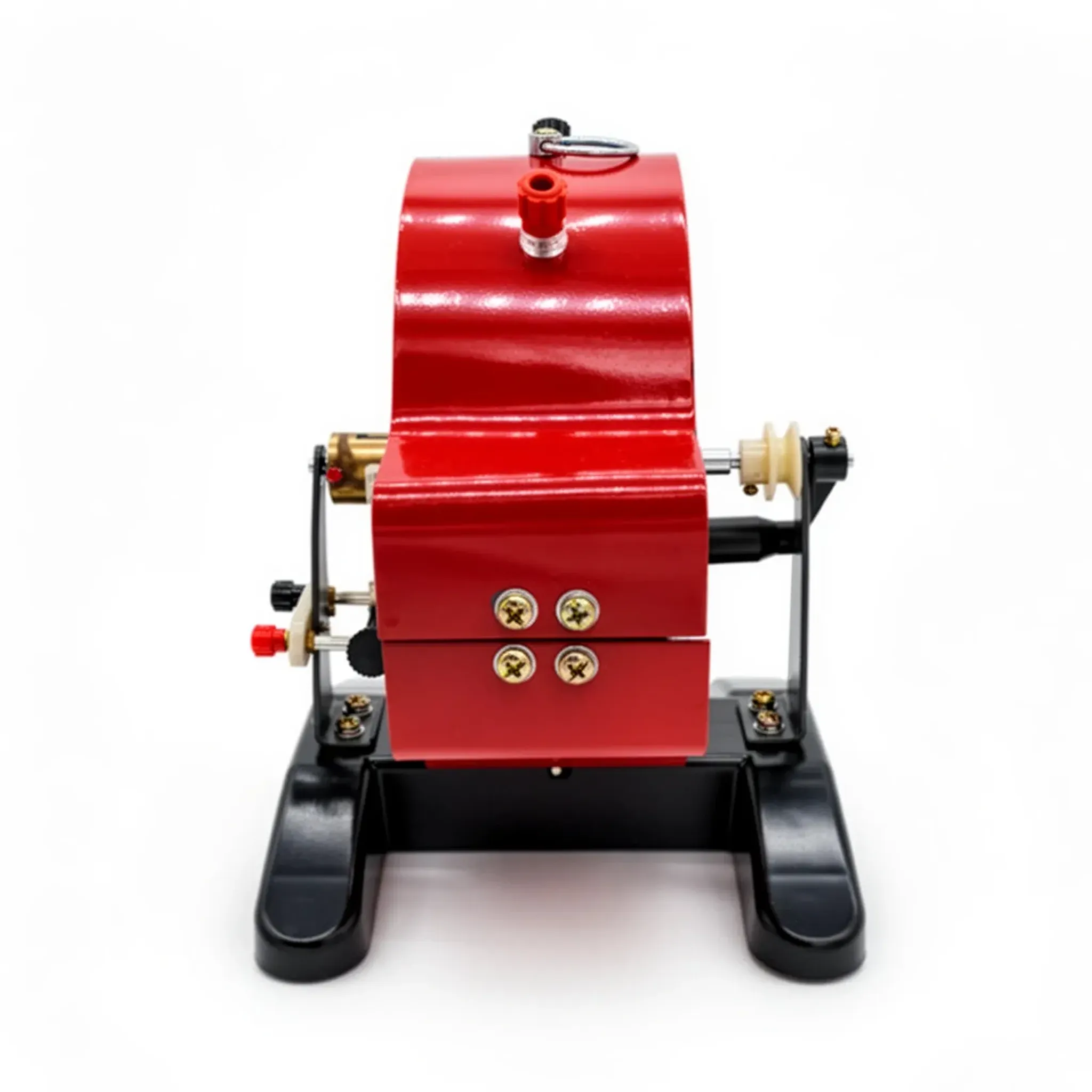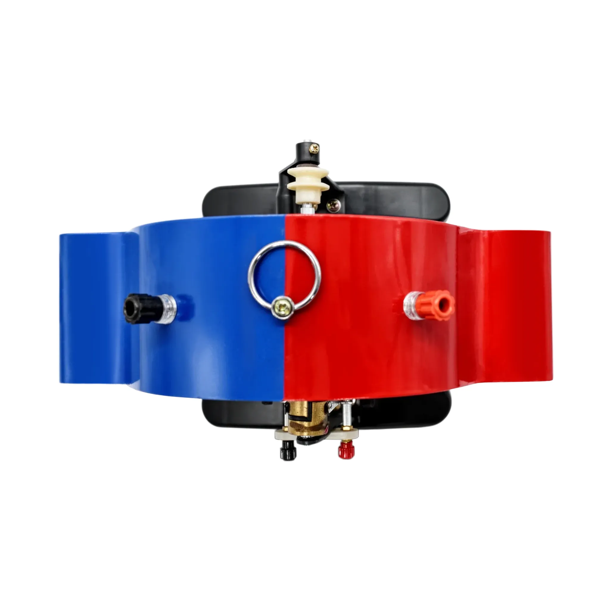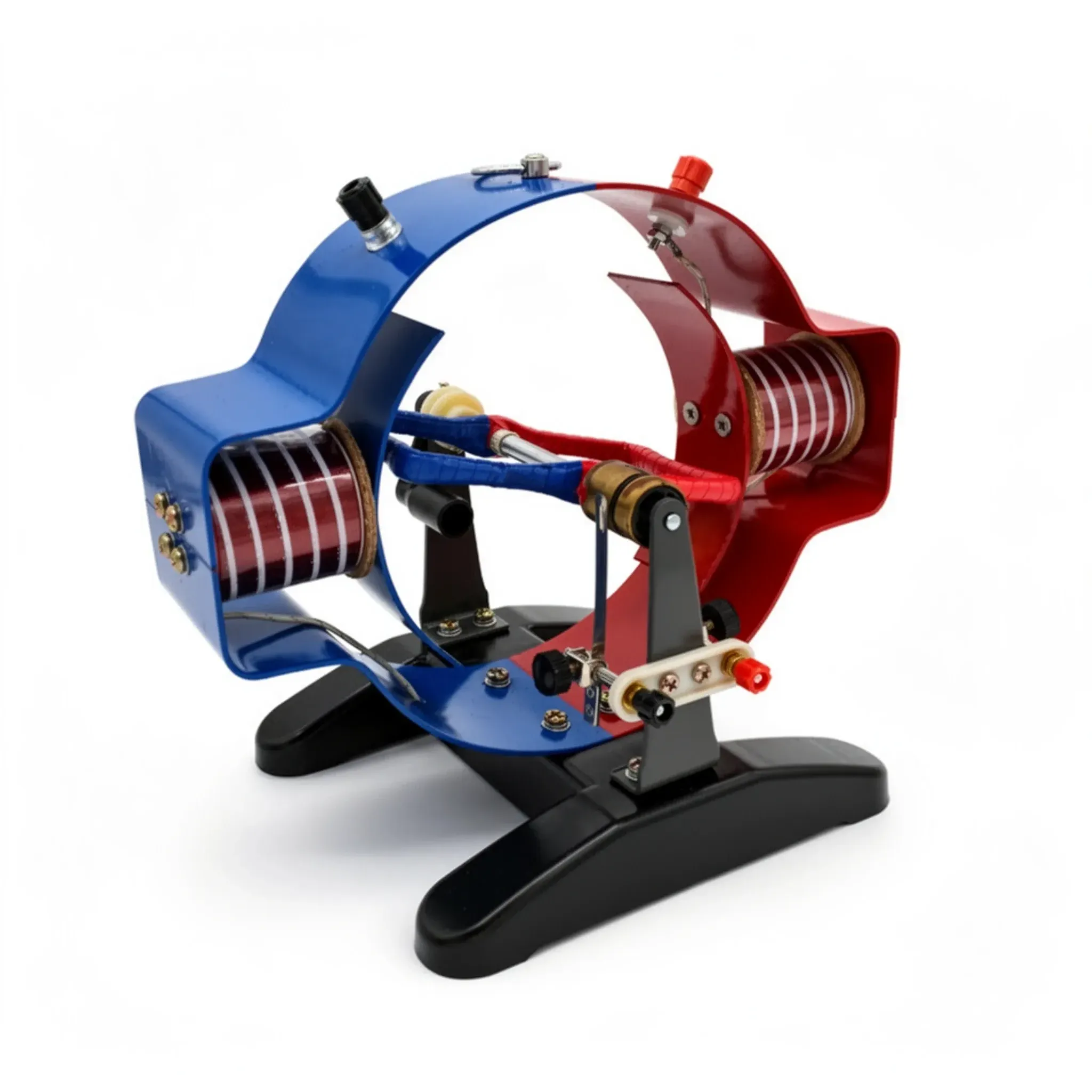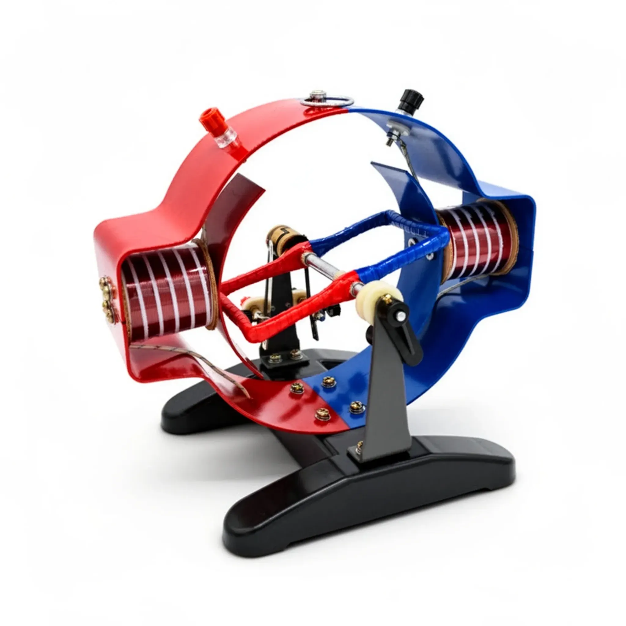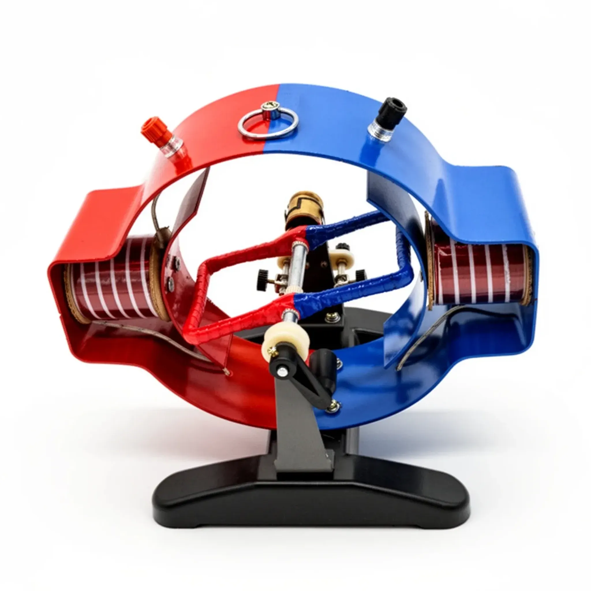 Прибор используется для демонстрации принципов работы электродвигателя и генератора. Модель наглядно показывает взаимосвязи между вращением якоря, направлением тока и линиями магнитной силы.Модель выполнена в виде кольцевой конструкции с двумя крупными секциями: красная — символизирует северный магнитный полюс, синяя — символизирует южный магнитный полюс. Внутри каждой секции видны катушки с обмоткой — это электромагниты, создающие магнитное поле. В центре конструкции расположен якорь (ротор) с валом, который может вращаться. На валу закреплена ручка или элемент для ручного запуска.