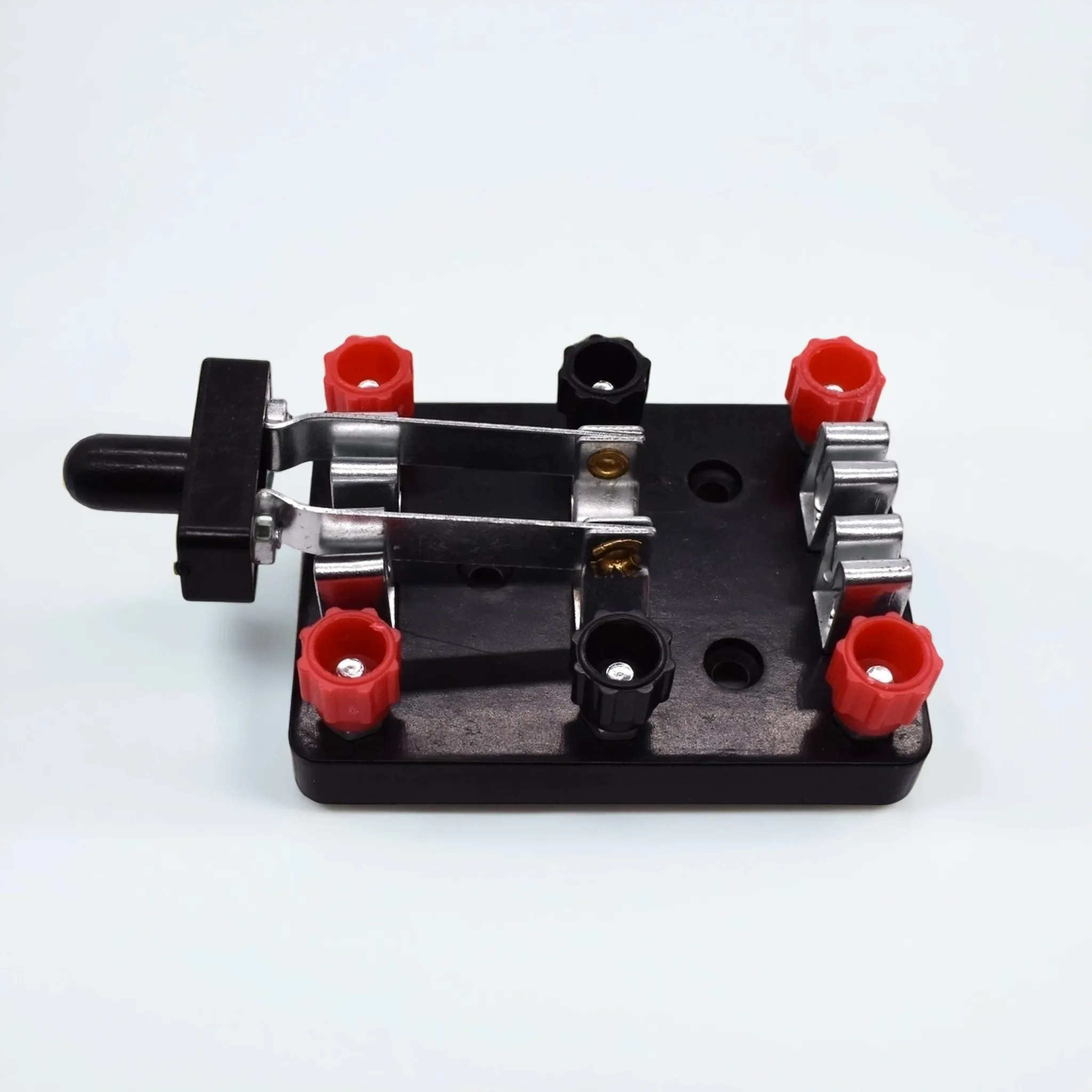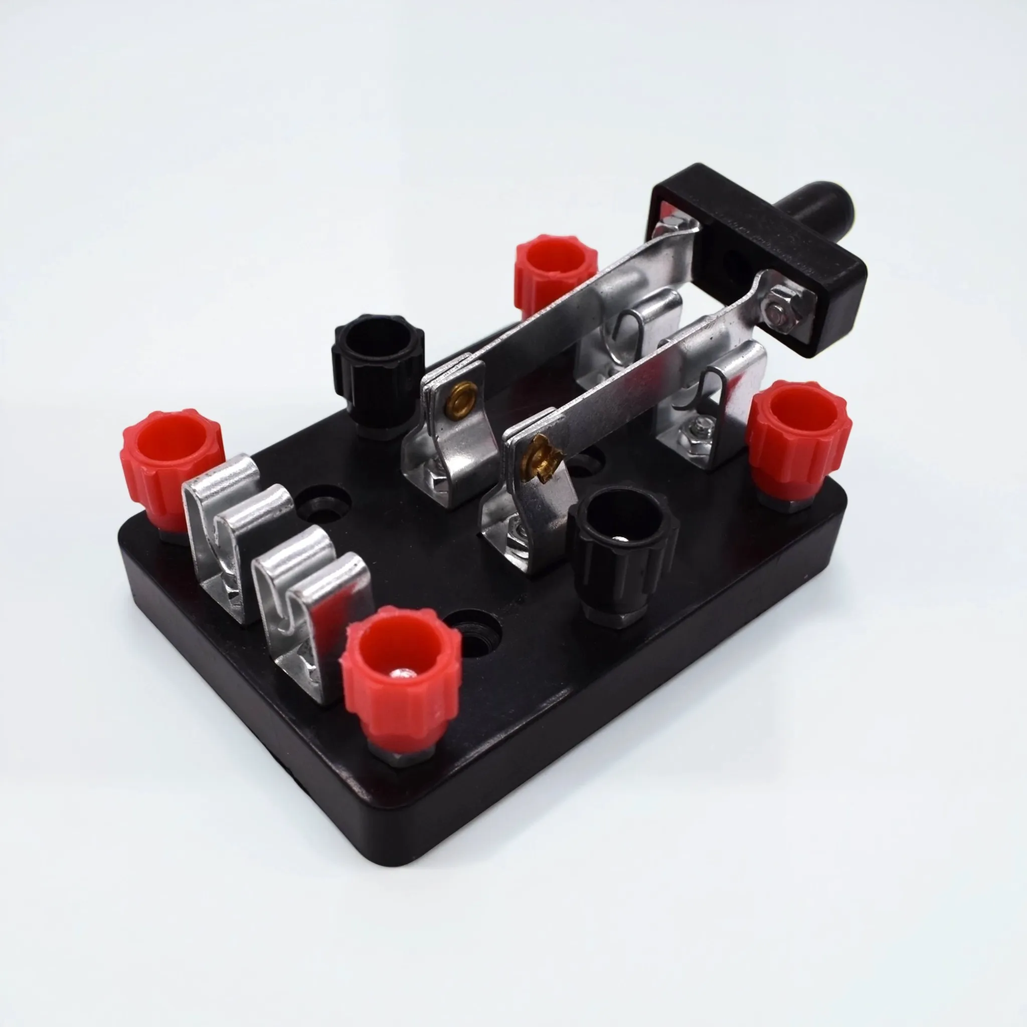 Переключатель двухполюсной — это надежное коммутационное устройство, предназначенное для оперативного замыкания, размыкания и переключения электрических цепей в ходе лабораторных работ по электродинамике. Прибор является обязательным элементом материально-технической базы кабинетов физики в средних и высших учебных заведениях, обеспечивая наглядность и безопасность учебного эксперимента.Конструкция переключателя оптимизирована для частого использования учащимися: прочное диэлектрическое основание исключает риск пробоя, а металлический рычаг с эргономичной пластиковой ручкой обеспечивает четкую фиксацию положений. Наличие винтовых зажимов с цветовой маркировкой (красный/черный) упрощает процесс сборки схем и минимизирует ошибки при подключении к источникам питания и измерительным приборам.