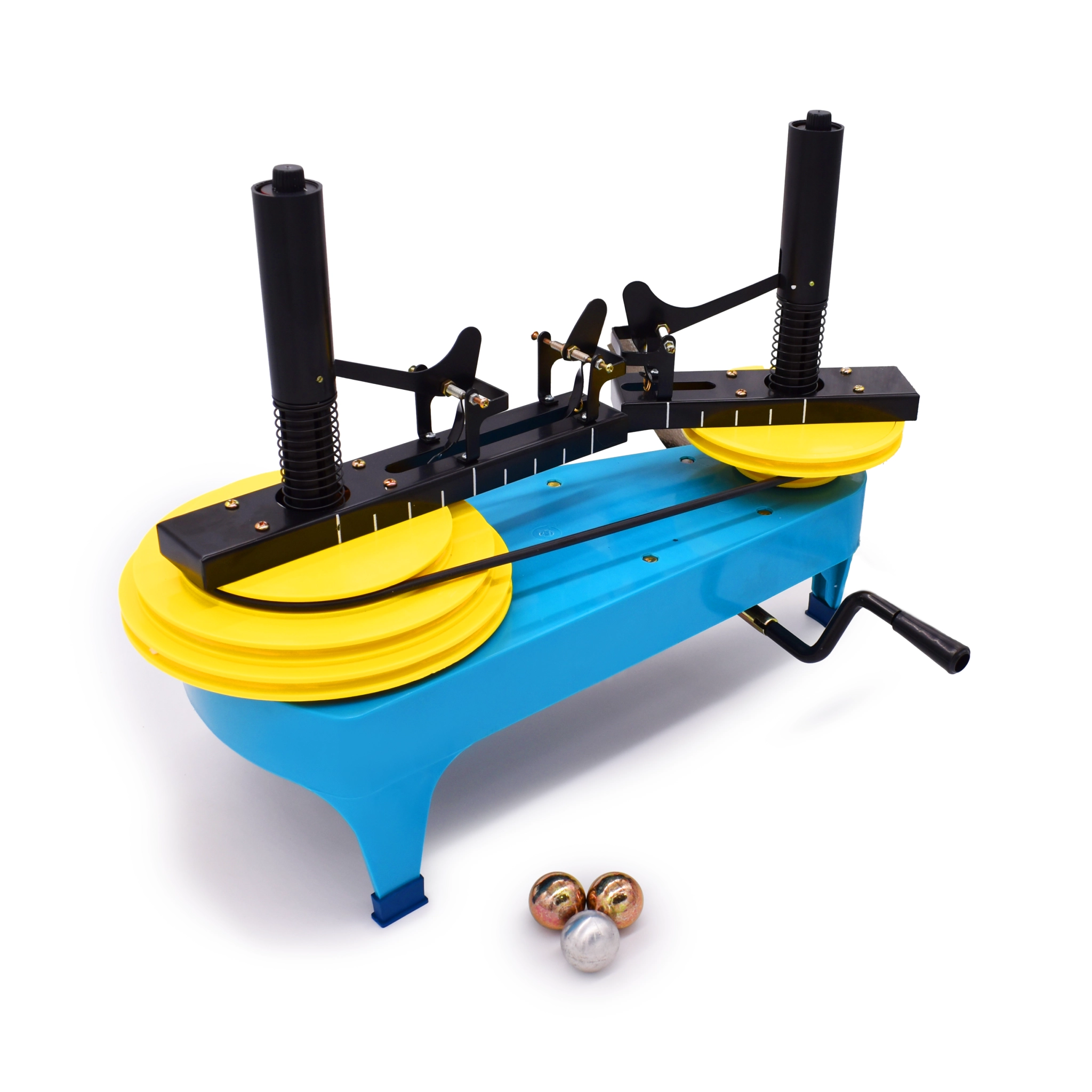 - Измерительный механизм: На дисках установлены градуированные плечи с направляющими (рельсами) для шаров. Рычажная система передает возникающую силу на вертикальные шкалы с подпружиненными кожухами для точной фиксации результатов.