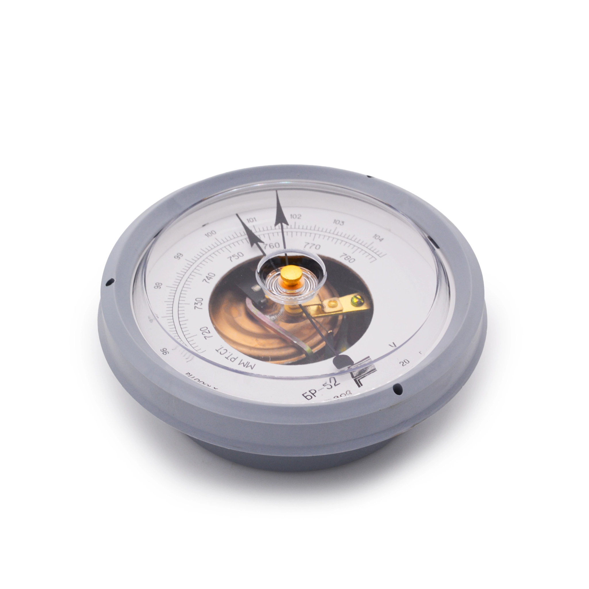 Механизм барометра смонтирован в круглом корпусе, с лицевой стороны защищен плоским стеклом. Корпус имеет кольцо для подвешивания прибора. Конструкция барометра предусматривает его эксплуатацию в настенном варианте.