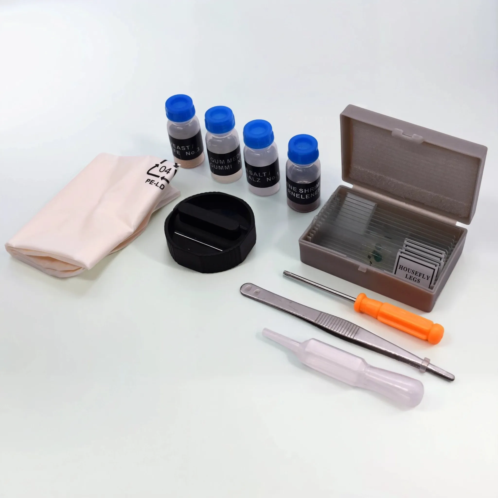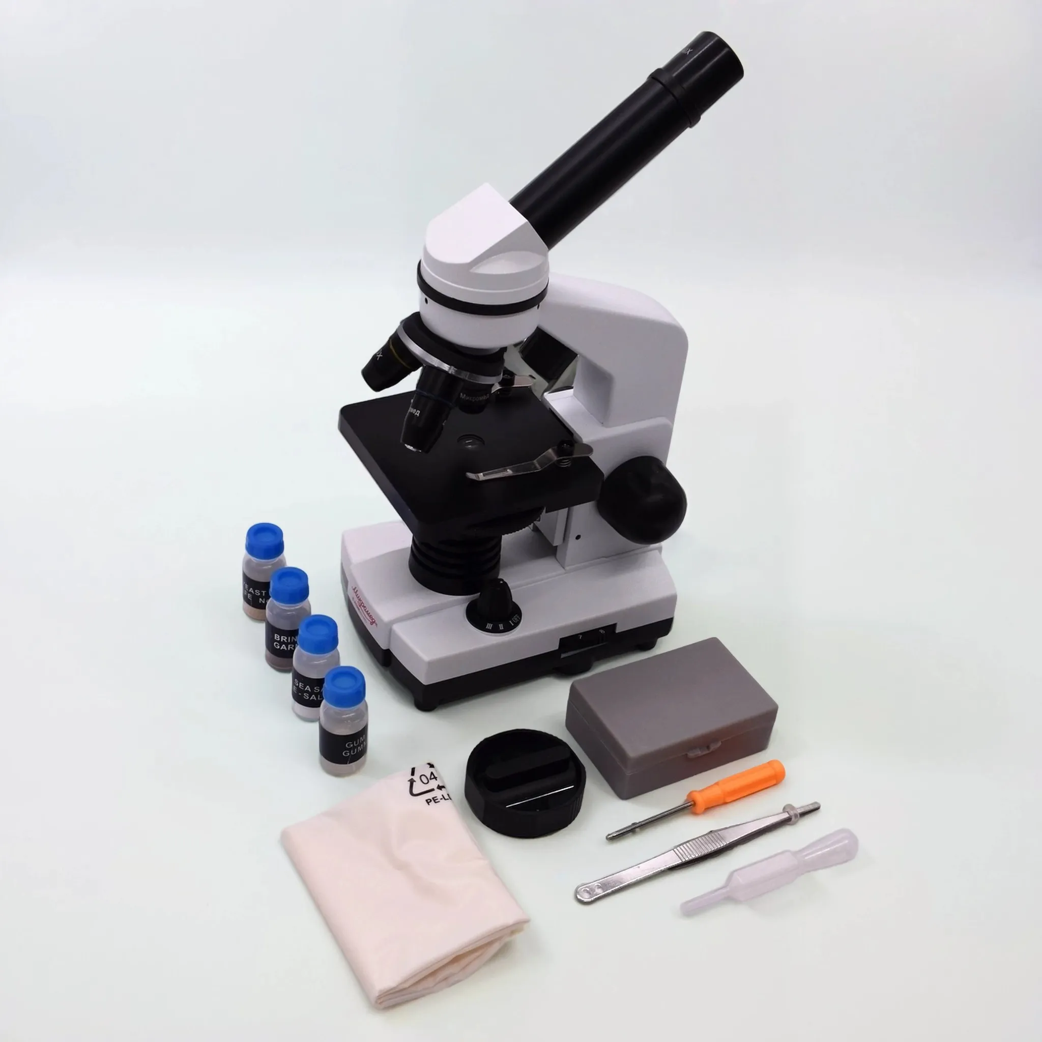 - Набор для опытов: предметные стекла (5 шт.), покровные стекла (5 шт.), готовые препараты (5 шт.).