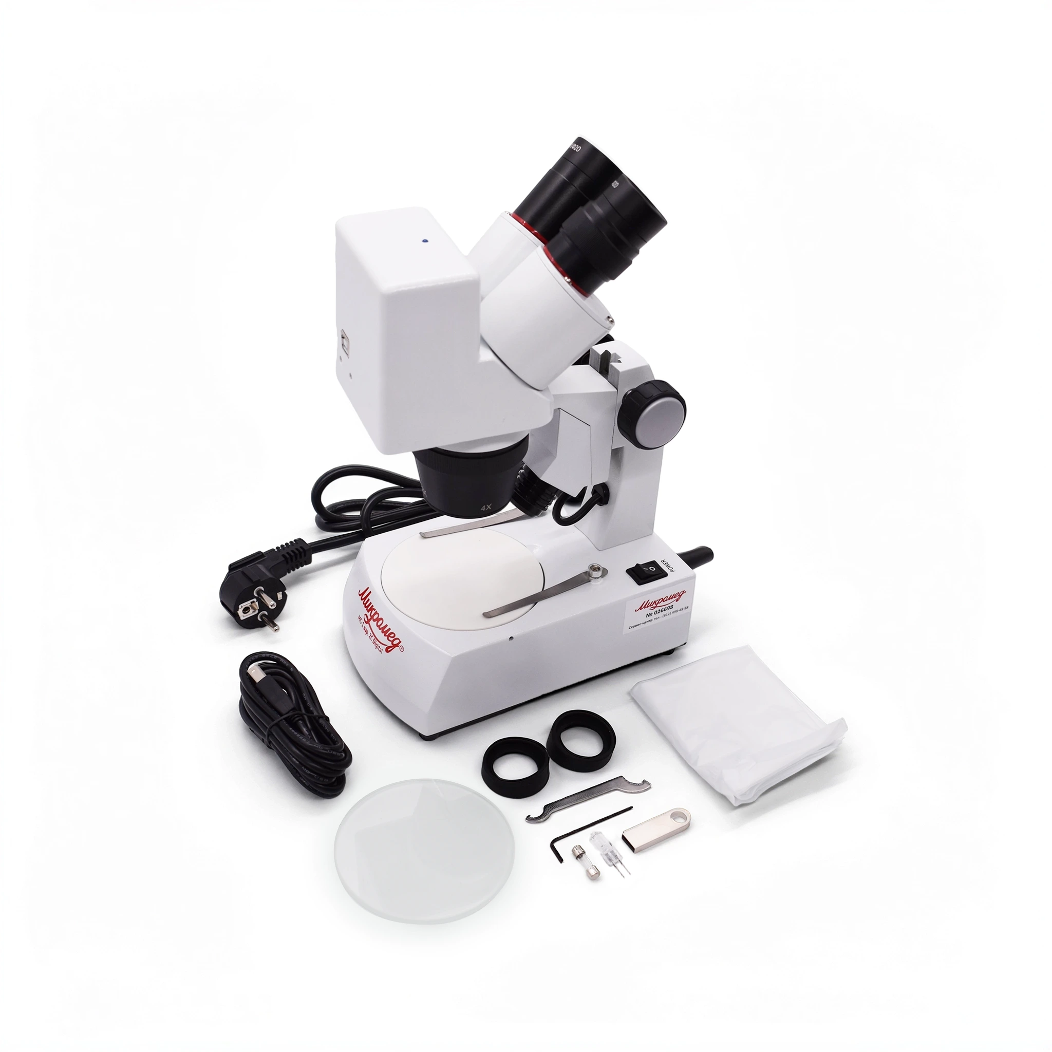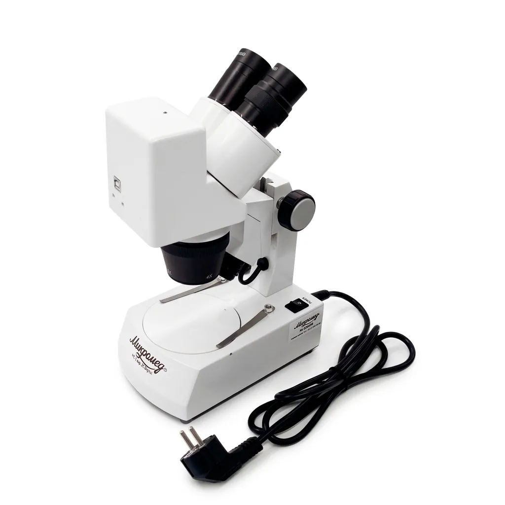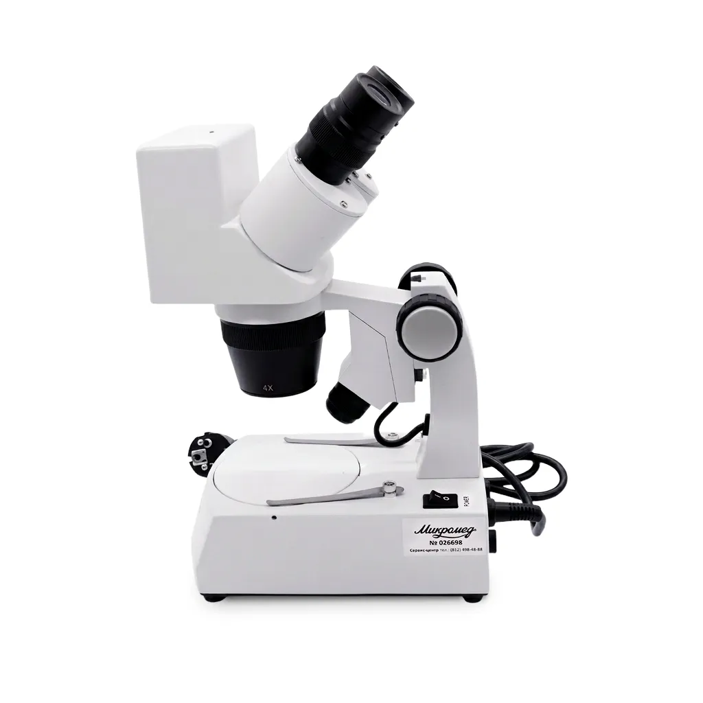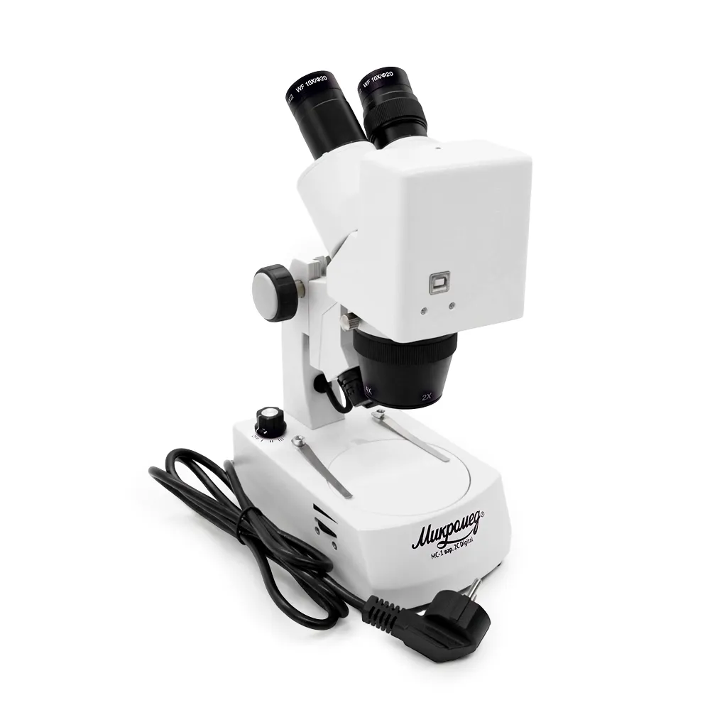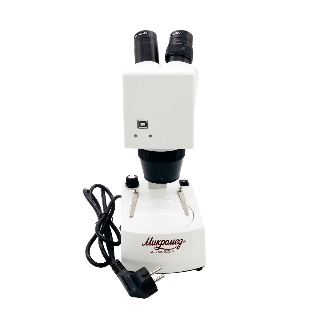 Стереоскопический микроскоп «Микромед МС-1 вар. 2С Digital» — это оптический прибор, предназначенный для наблюдения объёмных, тонких плёночных и прозрачных объектов, а также выполнения тонких работ, требующих точной координации глаз и рук.Прибор оснащен основанием со встроенным осветителем отражённого и проходящего света, а также штативом с фокусировочным механизмом. Особенностью модели является оптическая головка, состоящая из объективной части (револьвер на 2 пары объективов F76 мм) и бинокулярной визуальной насадки, в которую встроена камера 5 МП.