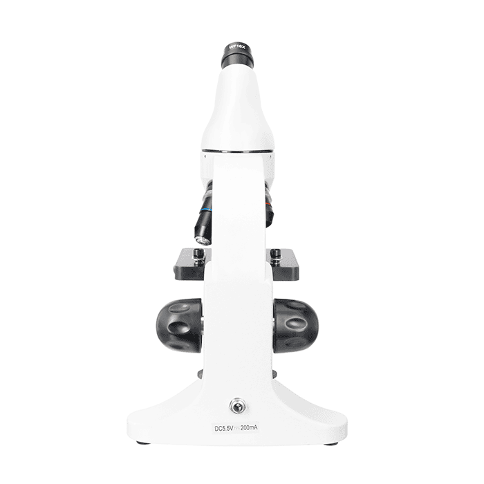 Корпус выполнен из металла, рассчитан на регулярную эксплуатацию в кабинете. Окулярная насадка наклонена под 45° и вращается на 360° — удобно при демонстрации, когда нужно повернуть микроскоп к группе учащихся, не двигая основание.Питание микроскопа возможно от сети, а также от батареек (актуально для занятий вне лаборатории или при ограниченном доступе к розеткам). Камера питается от компьютера по USB.