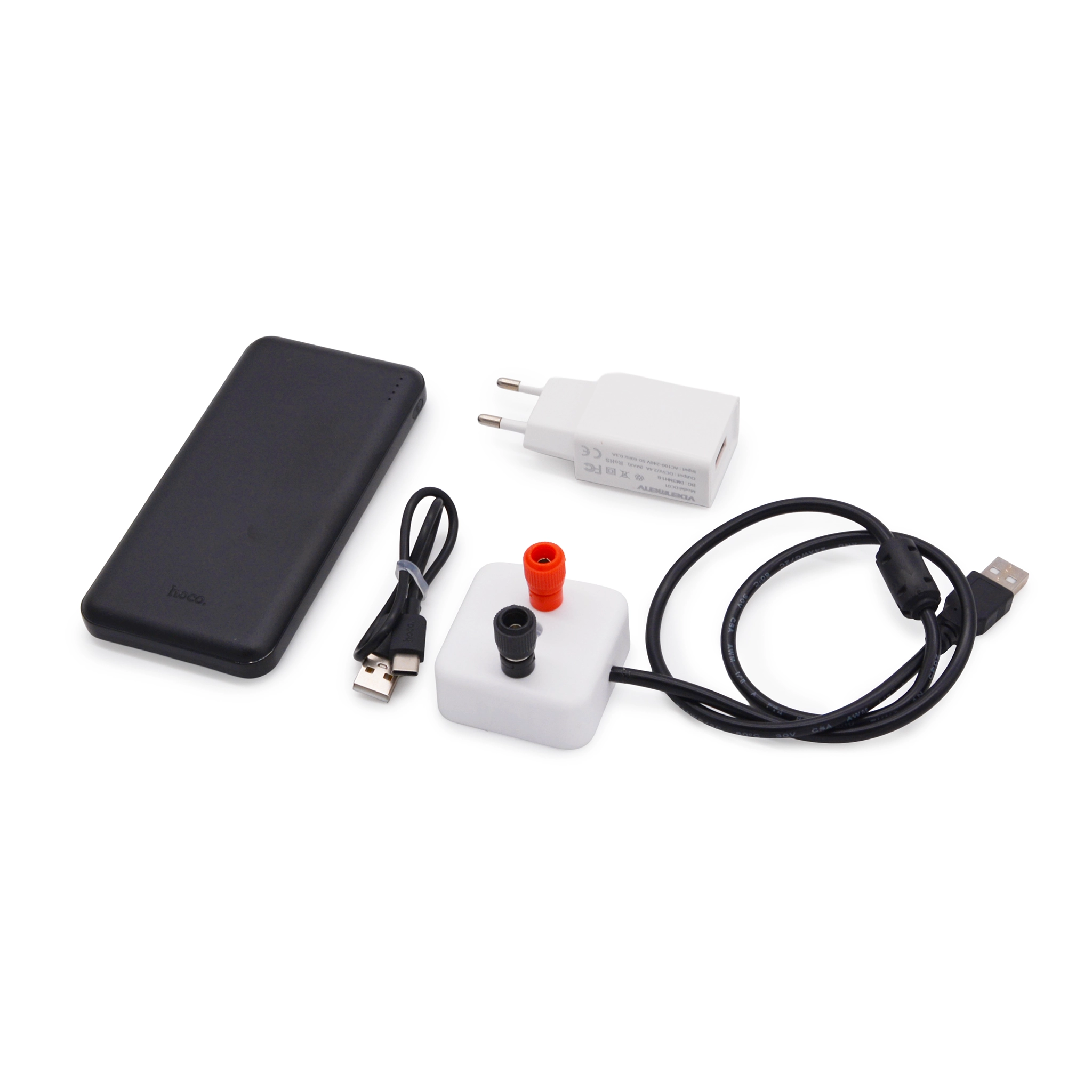 - Переходник-адаптер: вход USB, выход на клеммы типа Banana Socket (допустимый ток до 2,1 А).