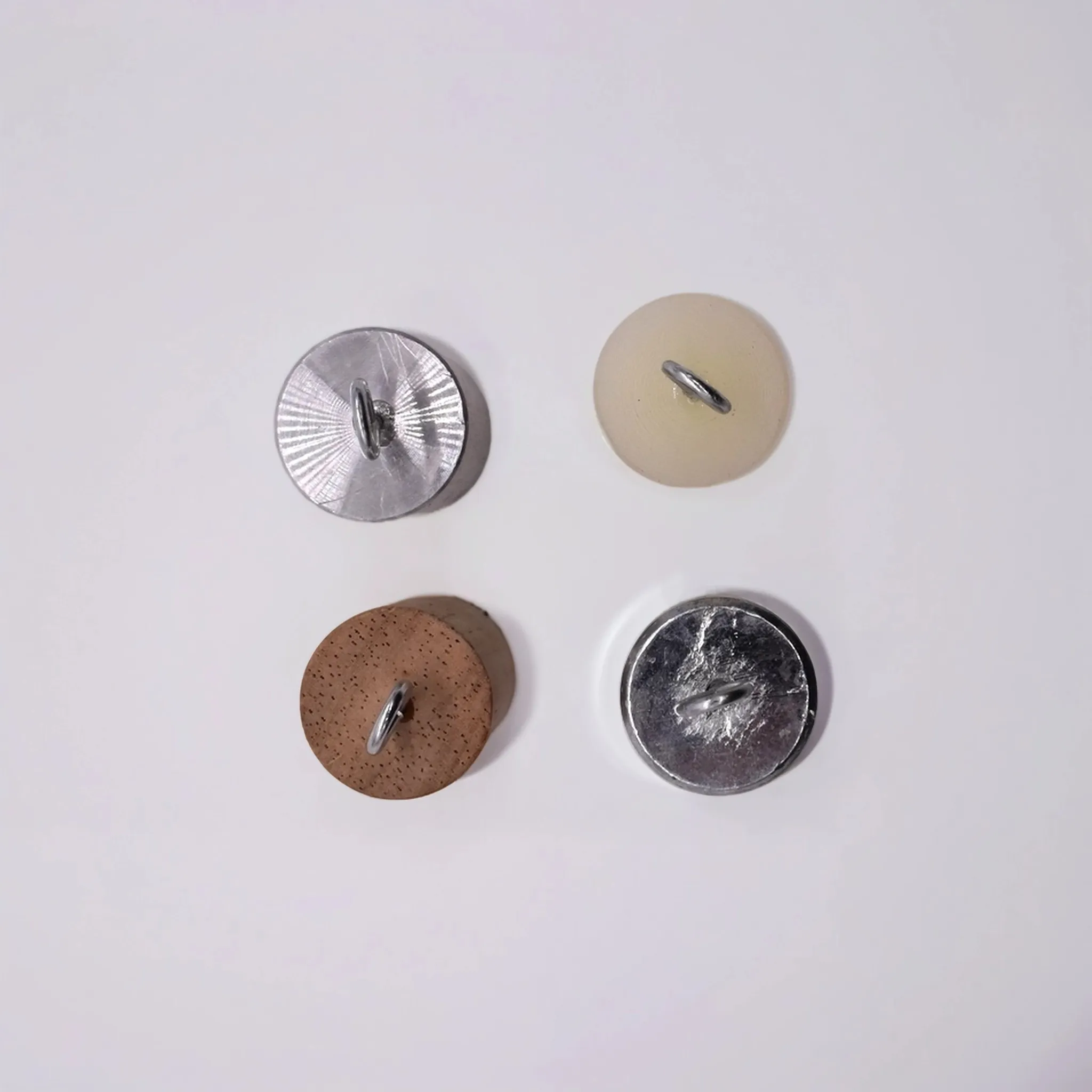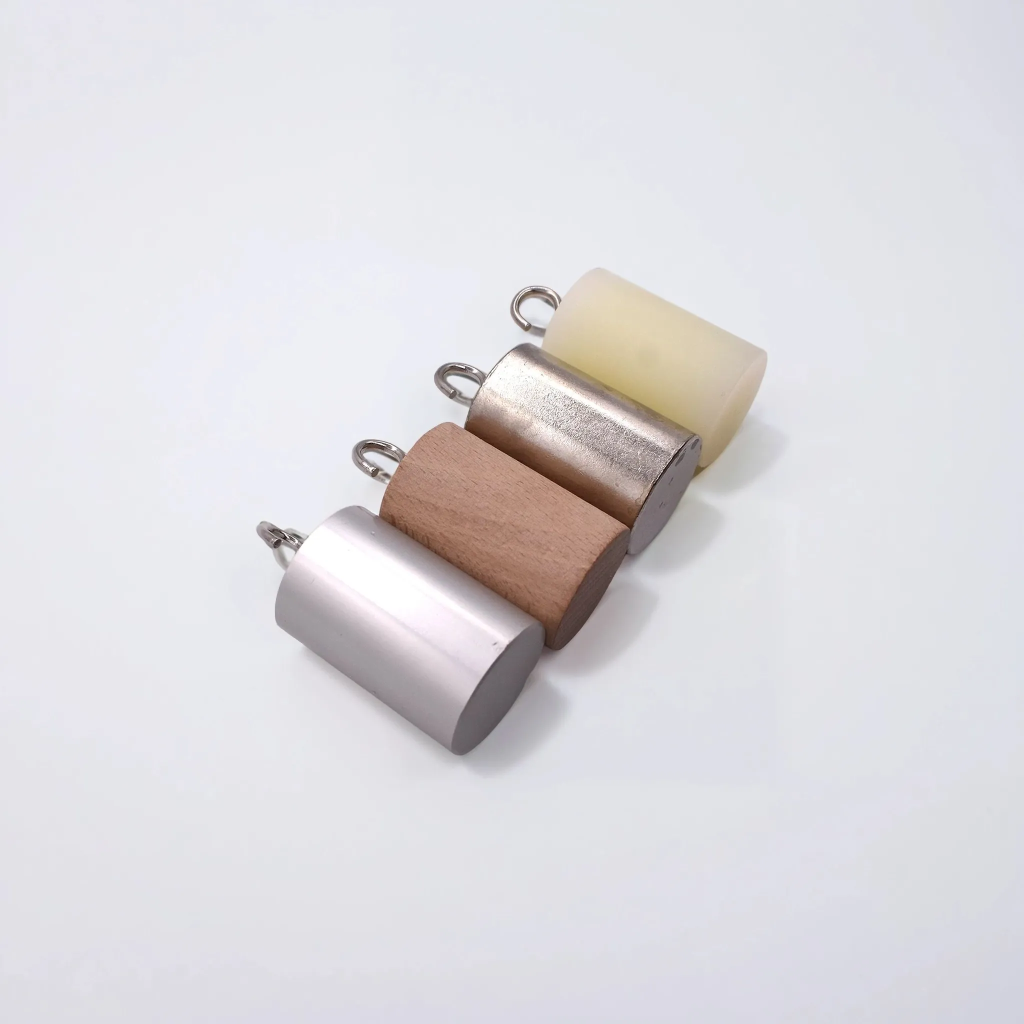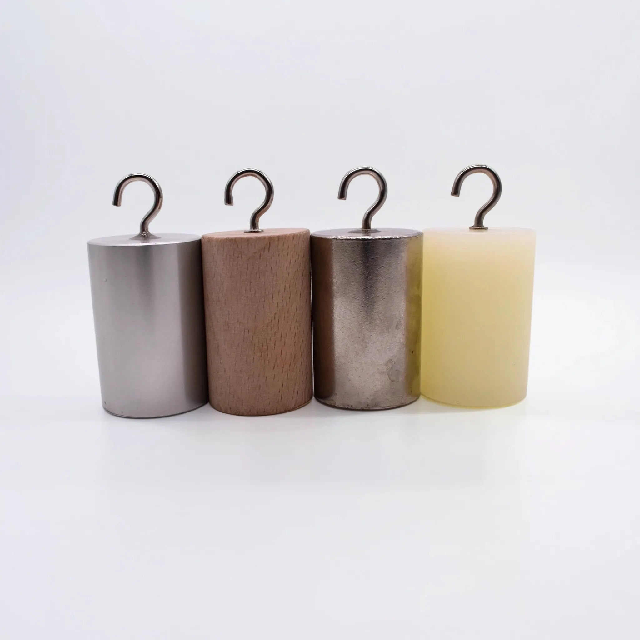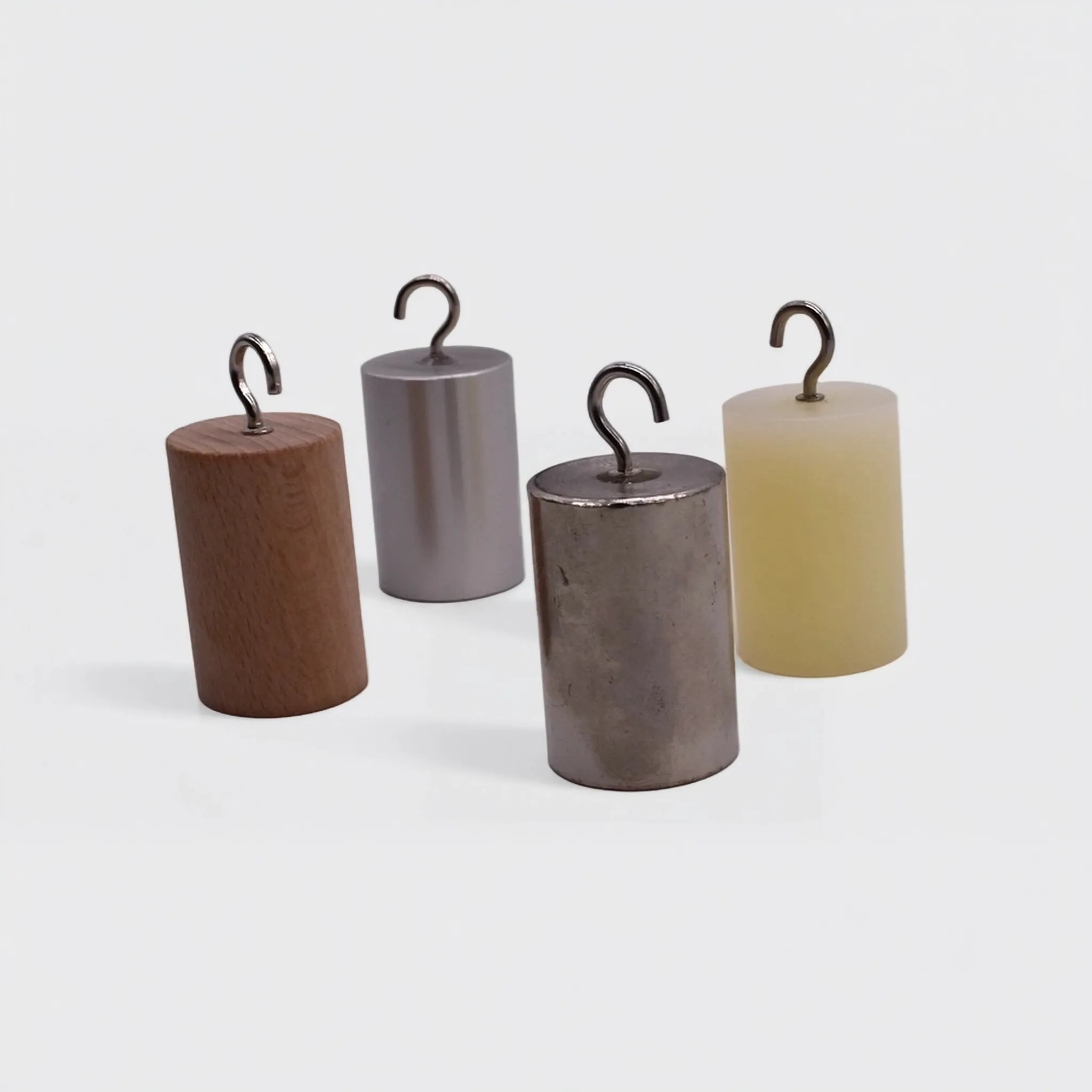 Набор состоит из 4 цилиндров, изготовленных из разных материалов (дерево, пластик, алюминий, сталь), каждый оснащён металлическим крючком для удобства подвешивания. Цилиндры имеют одинаковую массу, но различаются по объёму и материалу, что позволяет наглядно демонстрировать зависимость теплоёмкости от типа вещества.