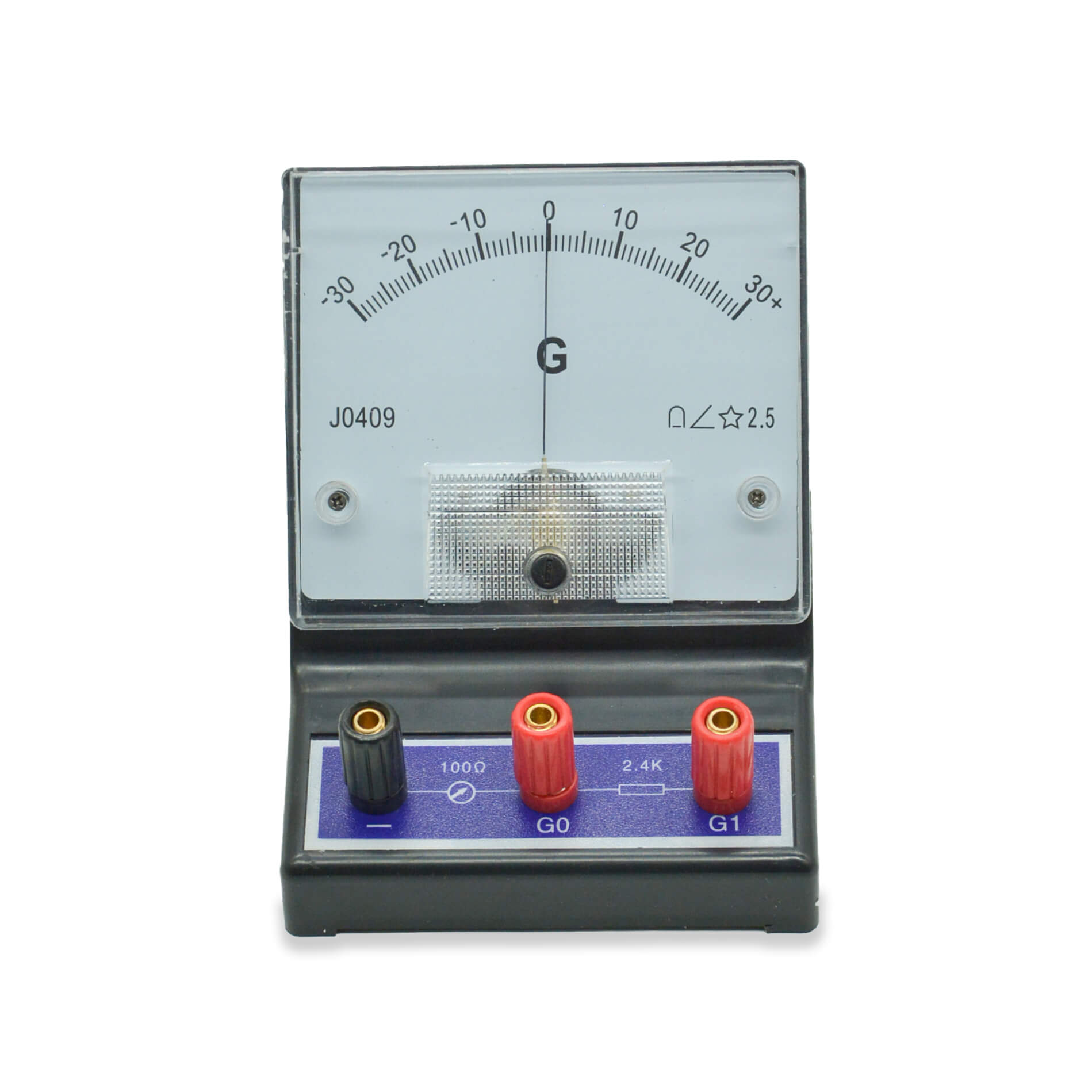Описание. Гальванометр модель J0409 представляет собой демонстрационный прибор, на внешней панели которого нанесена шкала и чувствительный магнитный сердечник со стрелкой. Для подключения приборов установлены специальные клеммы. Гальванометр является основным блоком для построения других измерительных приборов. Гальванометр предназначен для измерения величин постоянного тока (напряжения и сопротивления). Если к гальванометру не подключено никаких дополнительных резисторов, то он является одновременно амперметром и вольтметром. Гальванометр используется также в качестве указателя нуль-индикатора, т.е. отсутствия тока в электрических цепях. Принцип работы. Ток, проходящий через катушку гальванометра, создаёт магнитное поле, которое взаимодействует с постоянным магнитом, заставляя катушку вращаться. Это вращение вызывает отклонение стрелки, которая и отображает величину тока. Чем больше сила тока, тем больше отклонение стрелки. Если в цепи с гальванометром есть сопротивление, оно может влиять на силу тока и, следовательно, на показания прибора. Характеристики. Чувствительный диапазон: -30–0–30 мкА. Параметры окружающей среды для использования гальванометра: температура окружающей среды: 0 ℃+40 ℃; относительная влажность: ≤85%.