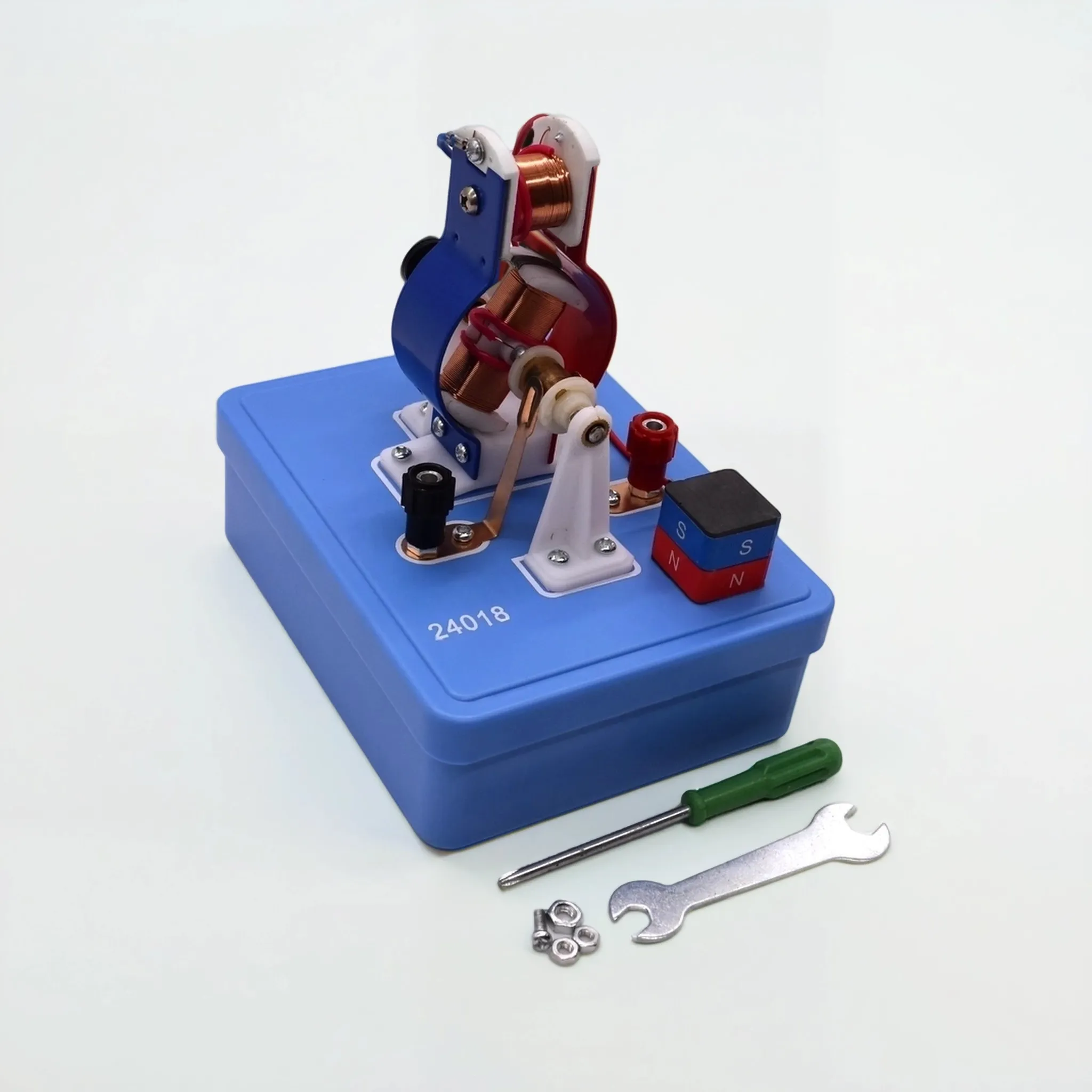 Лабораторная модель электродвигателя — это интерактивное учебное пособие, разработанное для глубокого изучения принципов работы машин постоянного тока на уроках физики. В отличие от готовых демонстрационных моделей, данный прибор является полностью разборным, что позволяет учащимся самостоятельно пройти путь от набора деталей до функционирующего устройства, понимая назначение каждого узла — от обмоток ротора до щеточного механизма.Модель предназначена для работы с низковольтными источниками питания (4–6 В) и идеально подходит для проведения фронтальных лабораторных работ. Она позволяет экспериментально подтвердить действие силы Ампера, изучить явление электромагнитной индукции и исследовать зависимость скорости вращения и мощности двигателя от параметров тока.