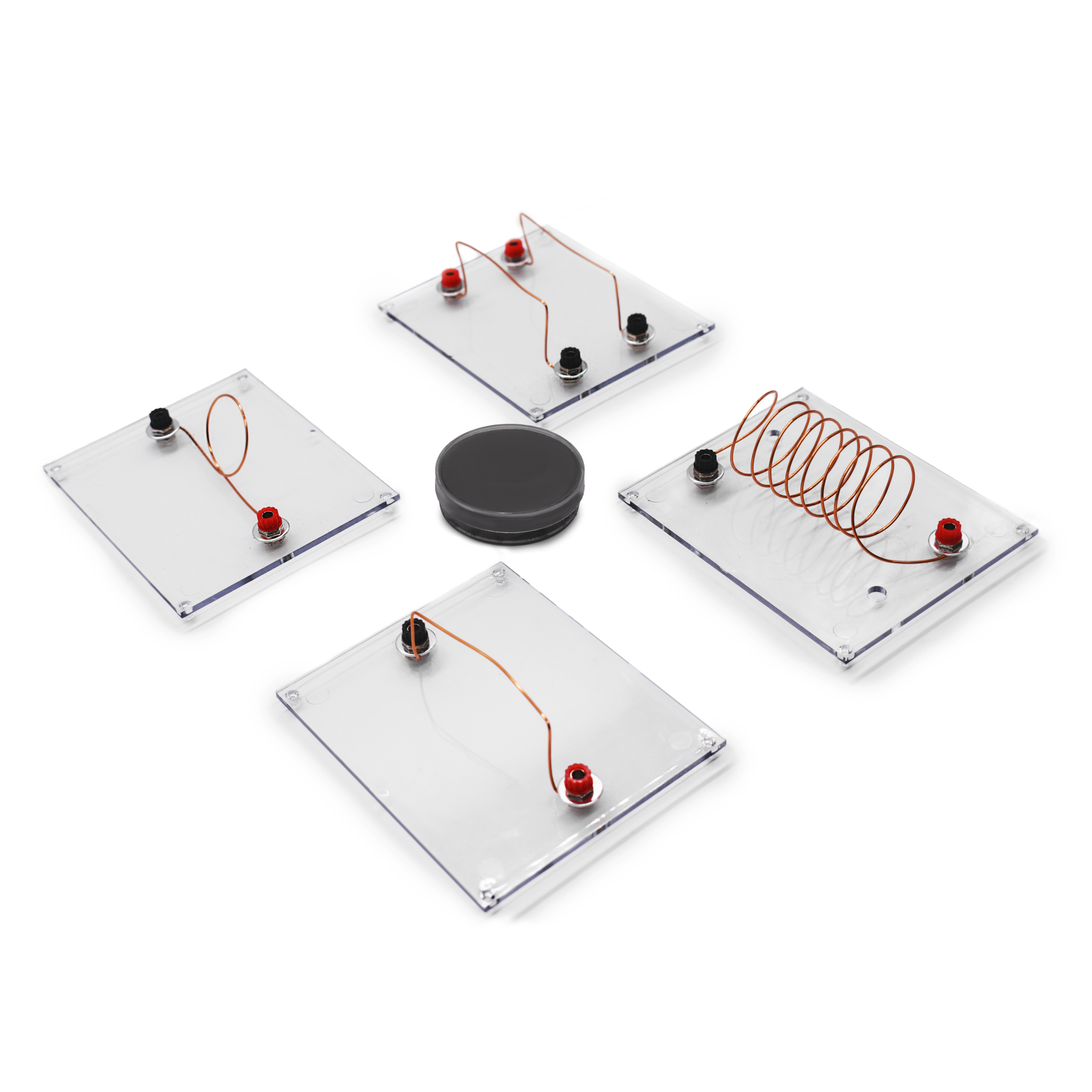 В состав набора входят прозрачные панели из органического стекла, сквозь которые пропущены проводники различной формы, выведенные на клеммы для подключения к источнику постоянного тока.
