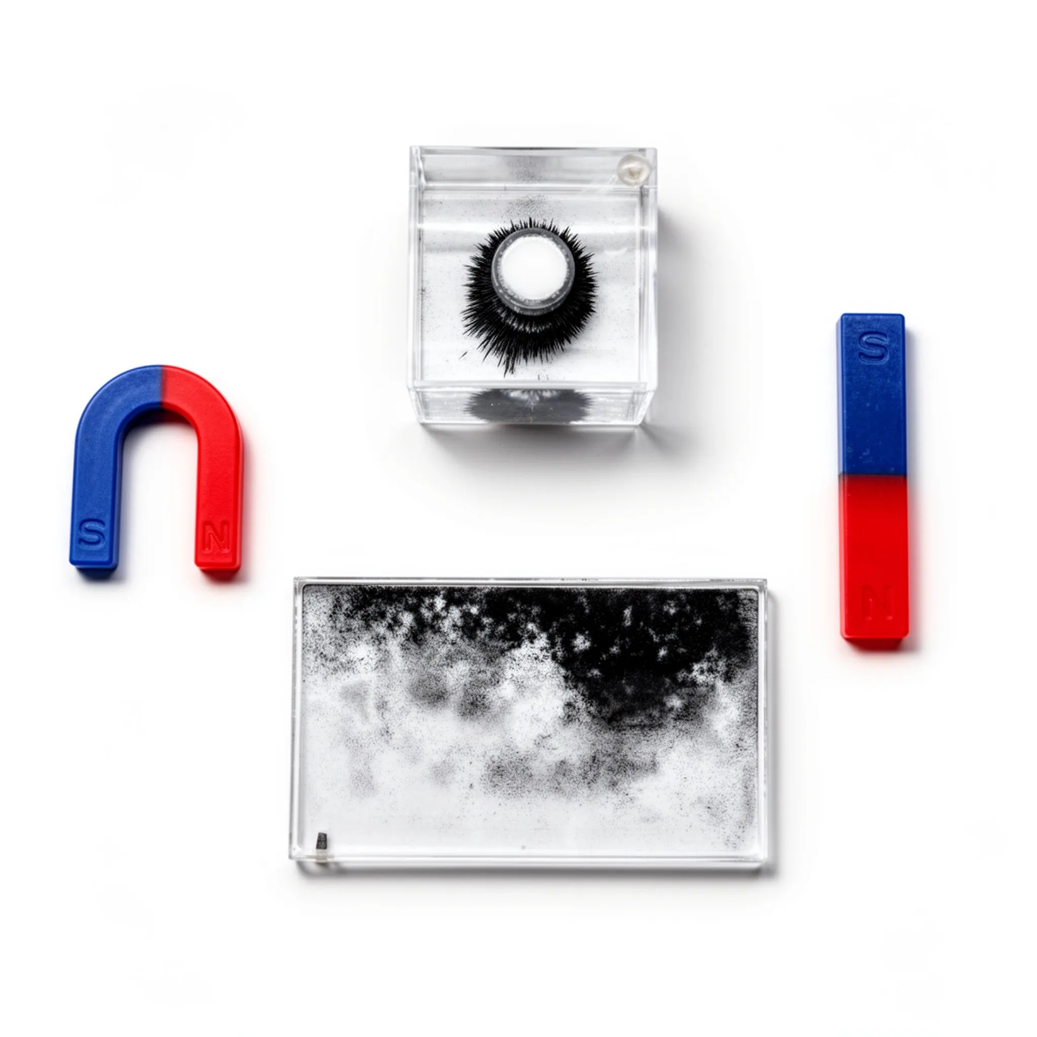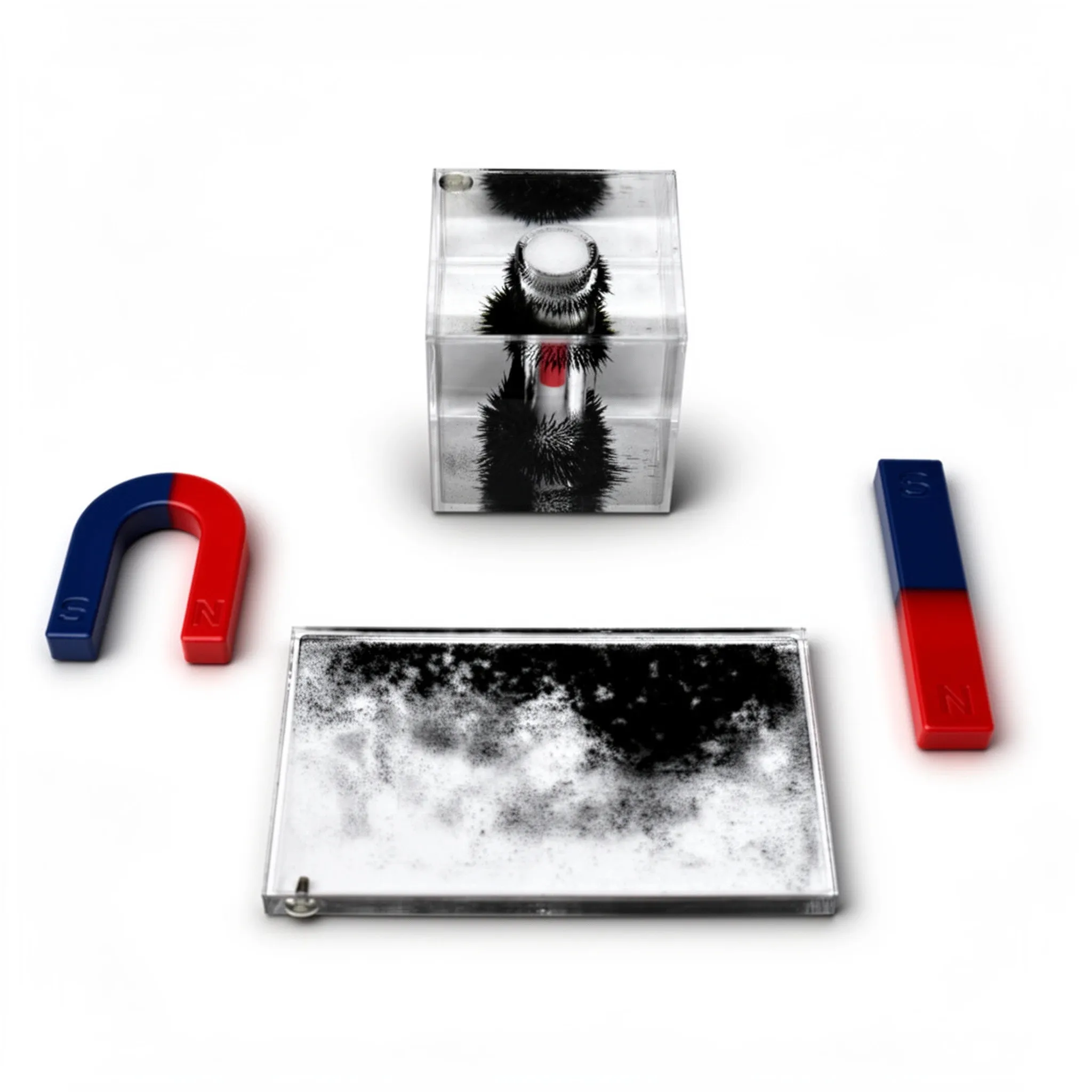 - Объемная визуализация: Прозрачный куб со встроенным центральным магнитом позволяет наблюдать распределение силовых линий в 3D-формате со всех сторон.
