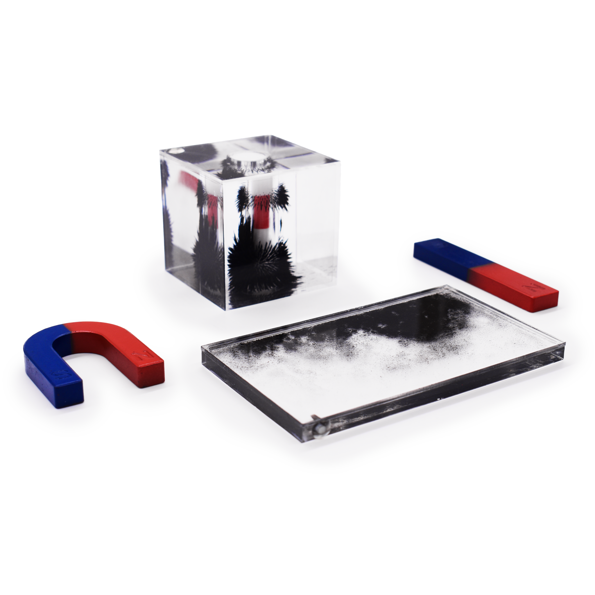 набор состоит из прозрачных плоского планшета и куба с вязкой прозрачной жидкостью с мелким магнитным порошком, постоянных полосового и U-образного магнитов.