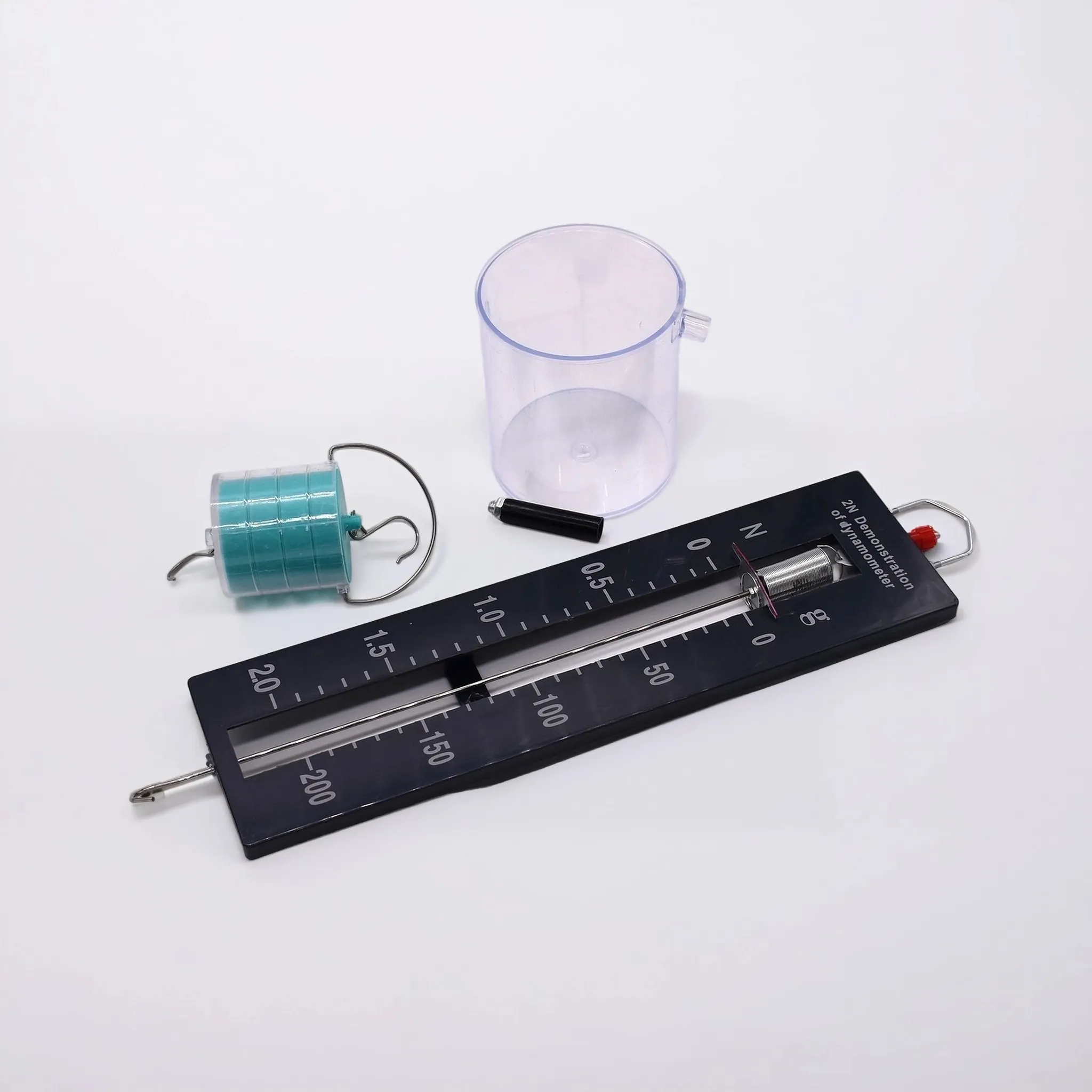 К пружине динамометра подвешивают ведерко и тело цилиндрической формы. Растяжение пружины (вес тела в воздухе) отмечают стрелкой на штативе. Затем тело опускают в сосуд с водой и наблюдают изменение растяжения пружины. Вытесненная жидкость собирается в отливной стакан, который затем подвешивают к телу — пружина возвращается к начальному уровню. На основании этого опыта делается вывод, что сила, выталкивающая целиком погруженное в жидкость тело, равна весу жидкости в объёме этого тела.