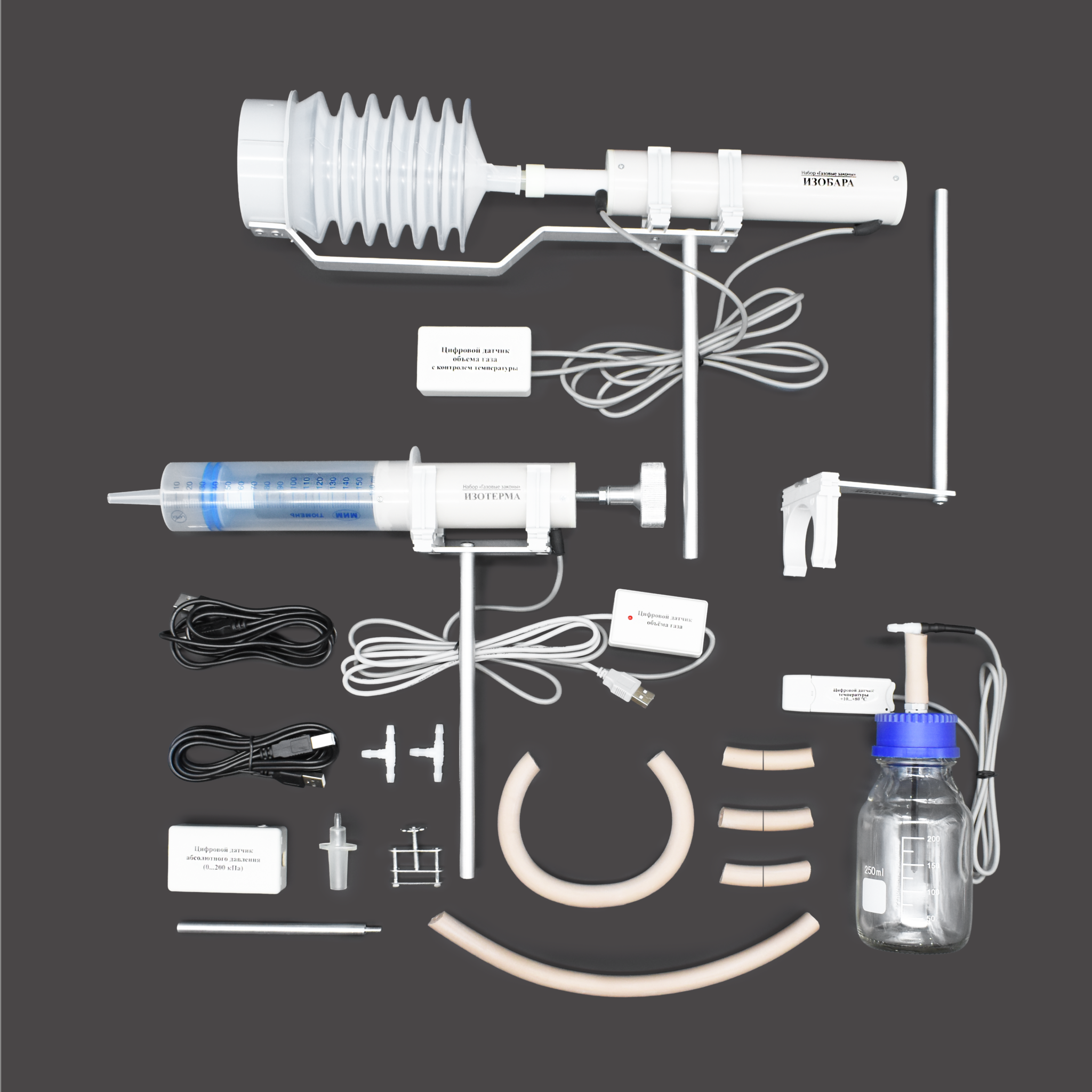 - Специализированные модули: Набор включает три готовые установки («Изотерма», «Изохора», «Изобара»), каждая из которых оснащена встроенными датчиками для изучения конкретного газового закона.