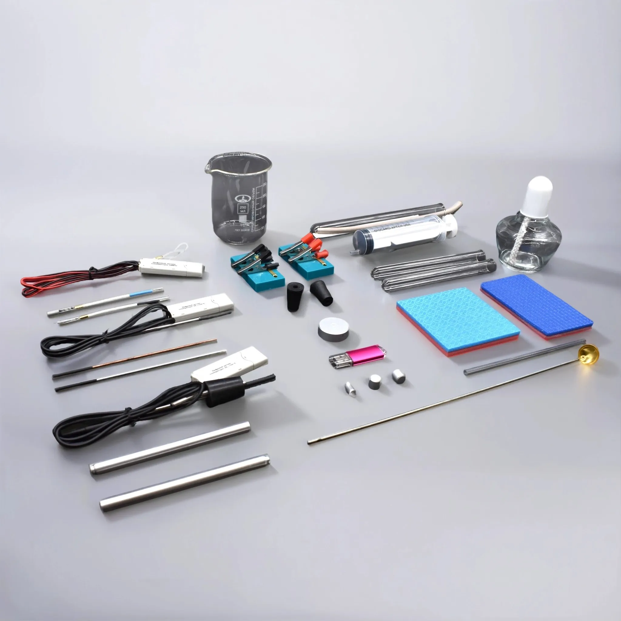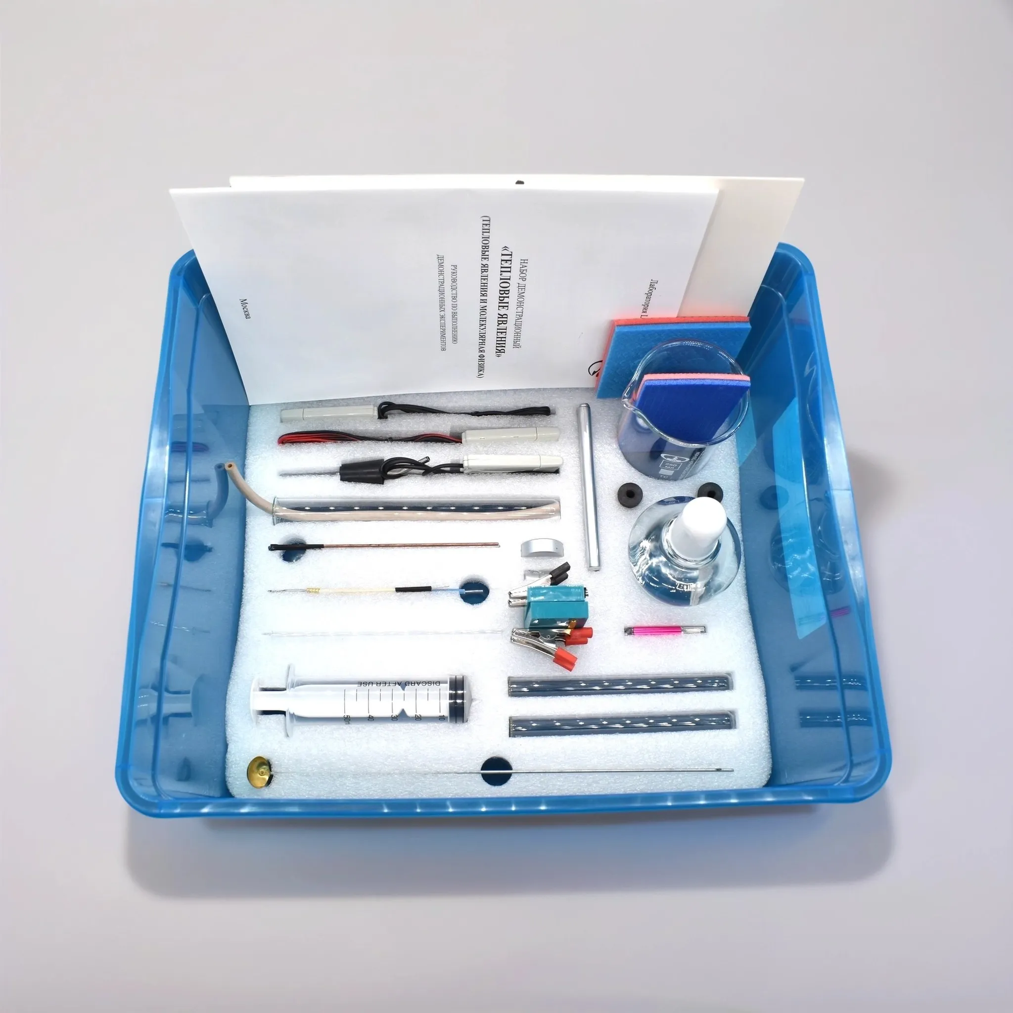 Набор демонстрационный «Молекулярная физика и тепловые явления» (далее - набор) предназначен для проведения опытов по изучению тепловых явлений, законов молекулярно-кинетической теории и термодинамических начал с использованием датчиков температуры и компьютерного измерительного блока для прямого сравнения теплофизических характеристик различных тел и процессов. Работает совместно с компьютерным измерительным блоком.