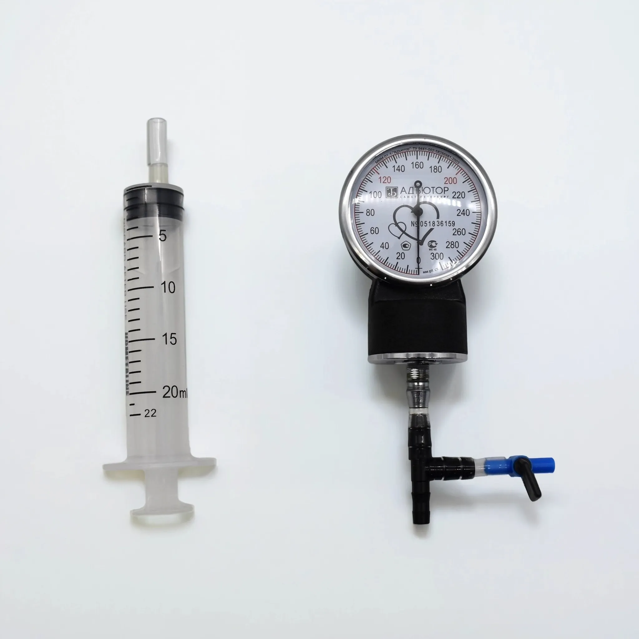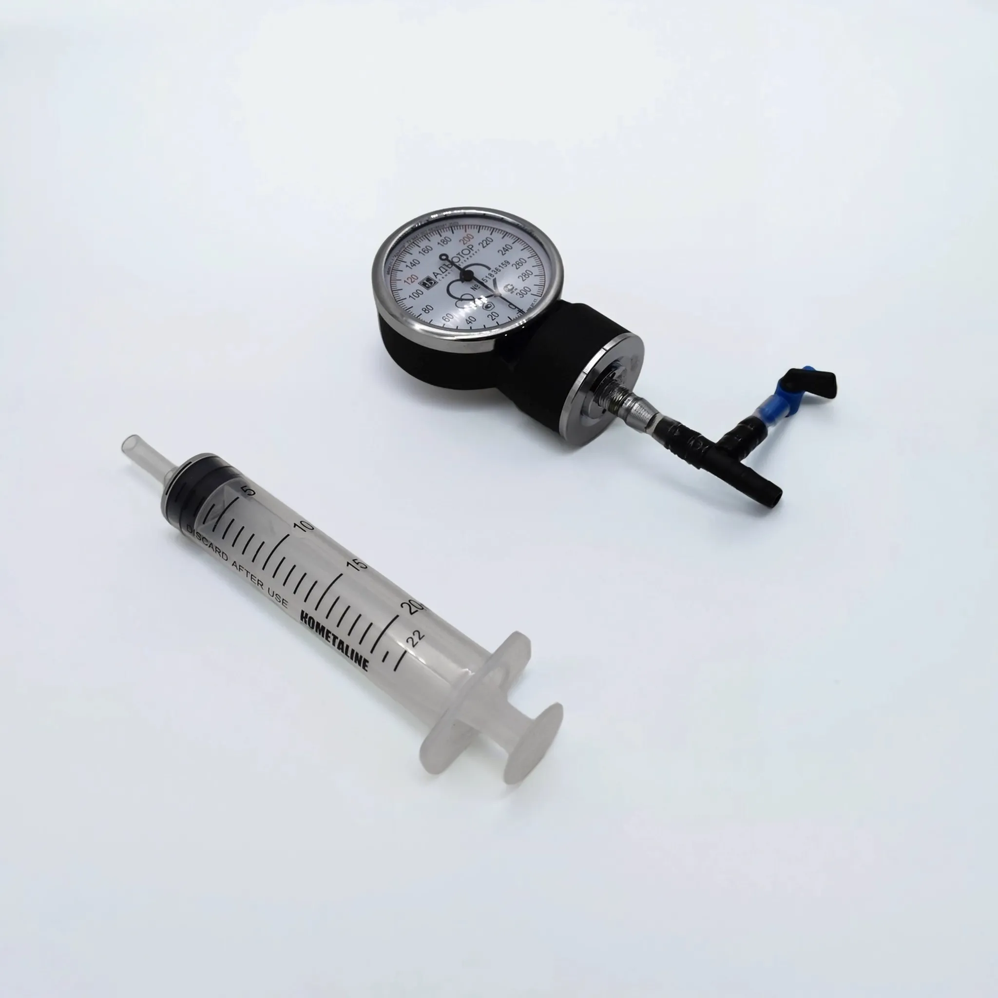 Основными частями набора являются стрелочный манометр, шприц и кран. Все части соединены между собой эластичными трубками с помощью тройника.
