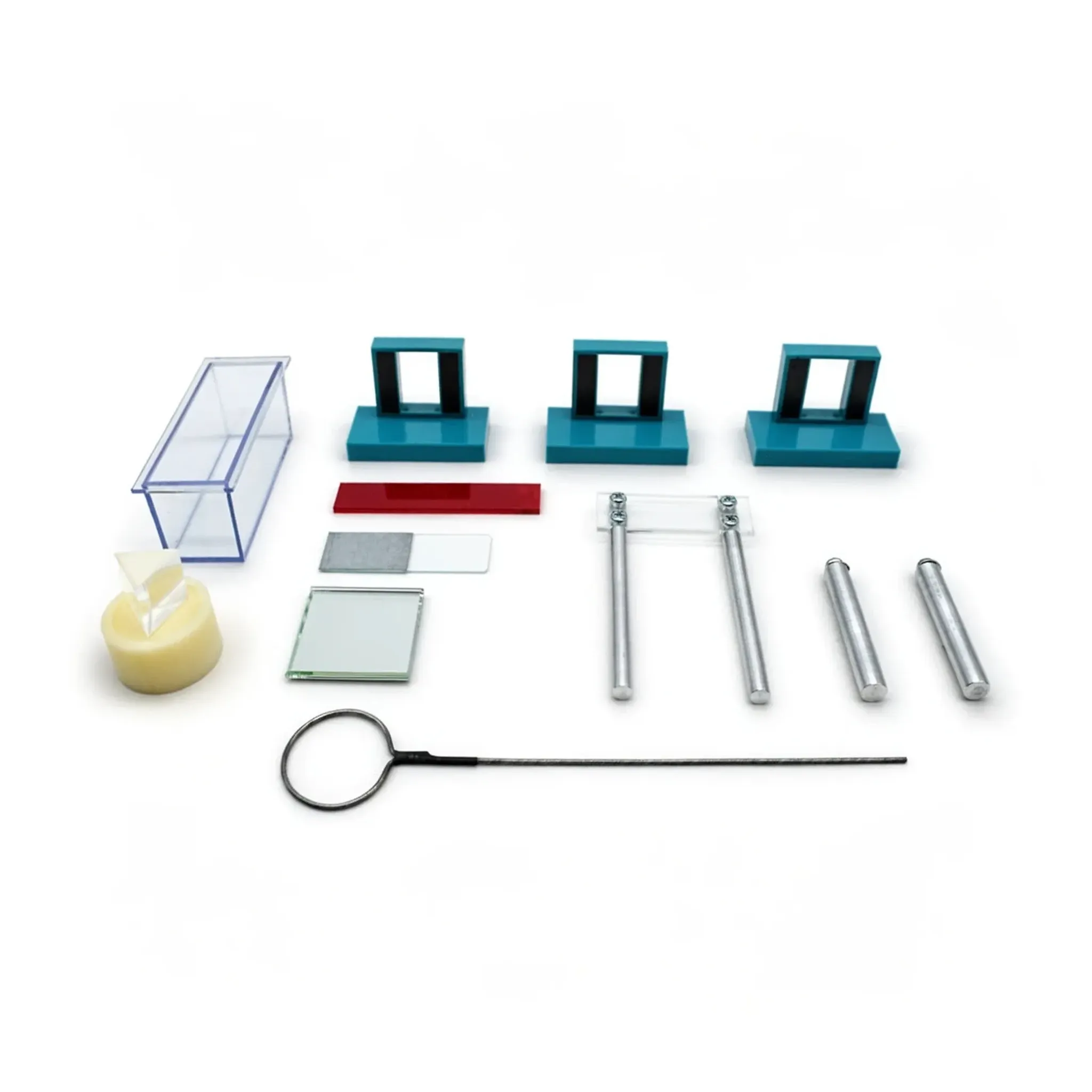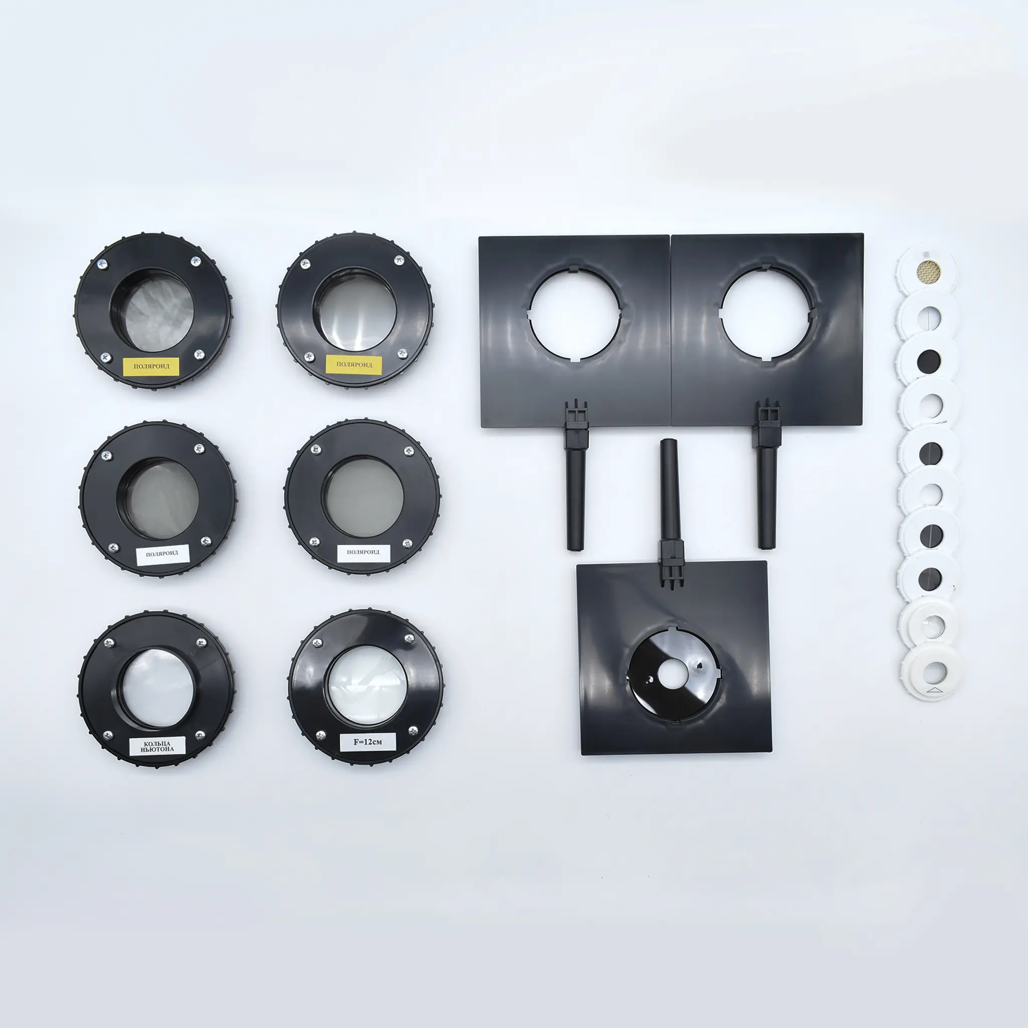- Оптические блоки: лазер, линзы (сборная, ЛС 1, «Щели Юнга»), поляроиды (2 шт.), призма «Флинт».