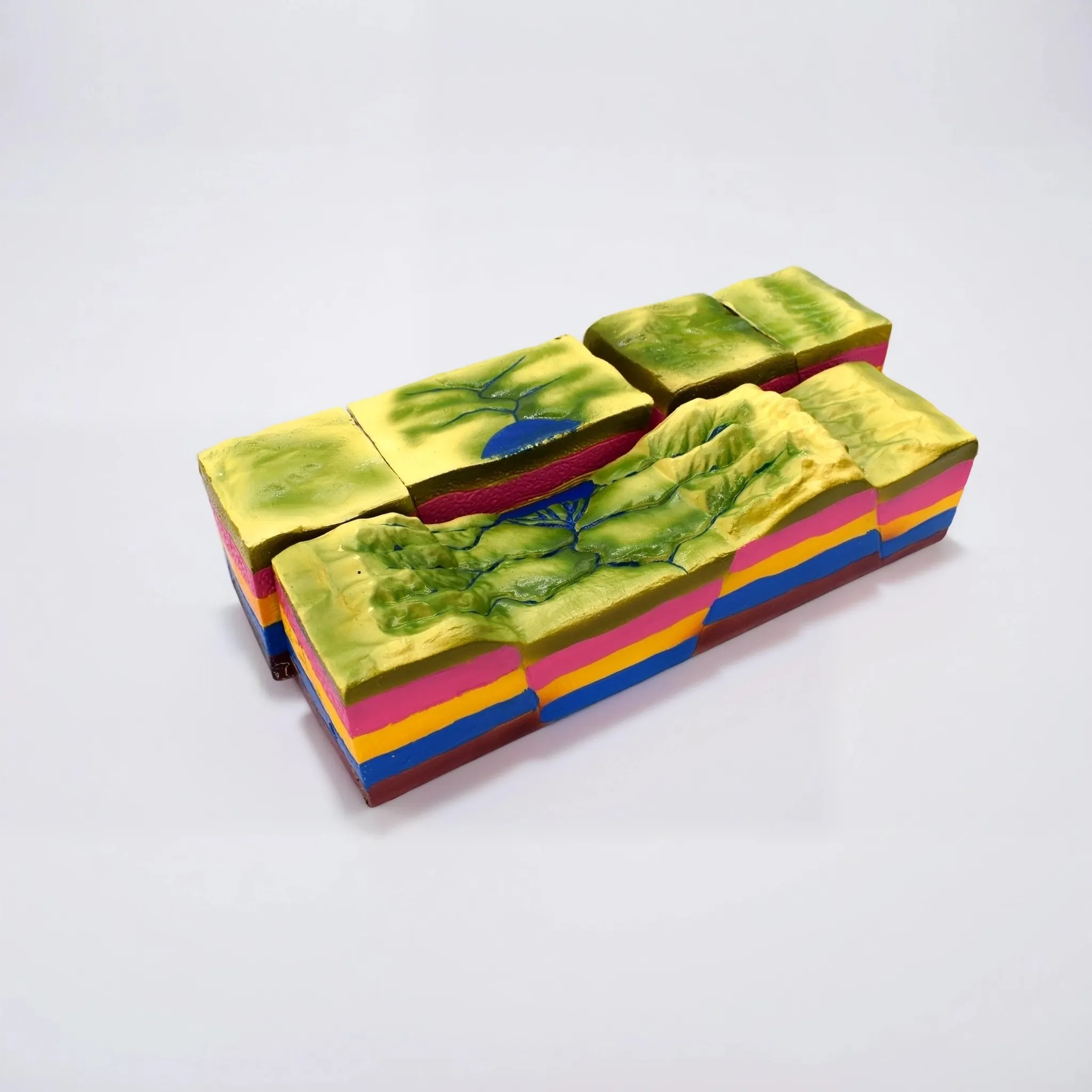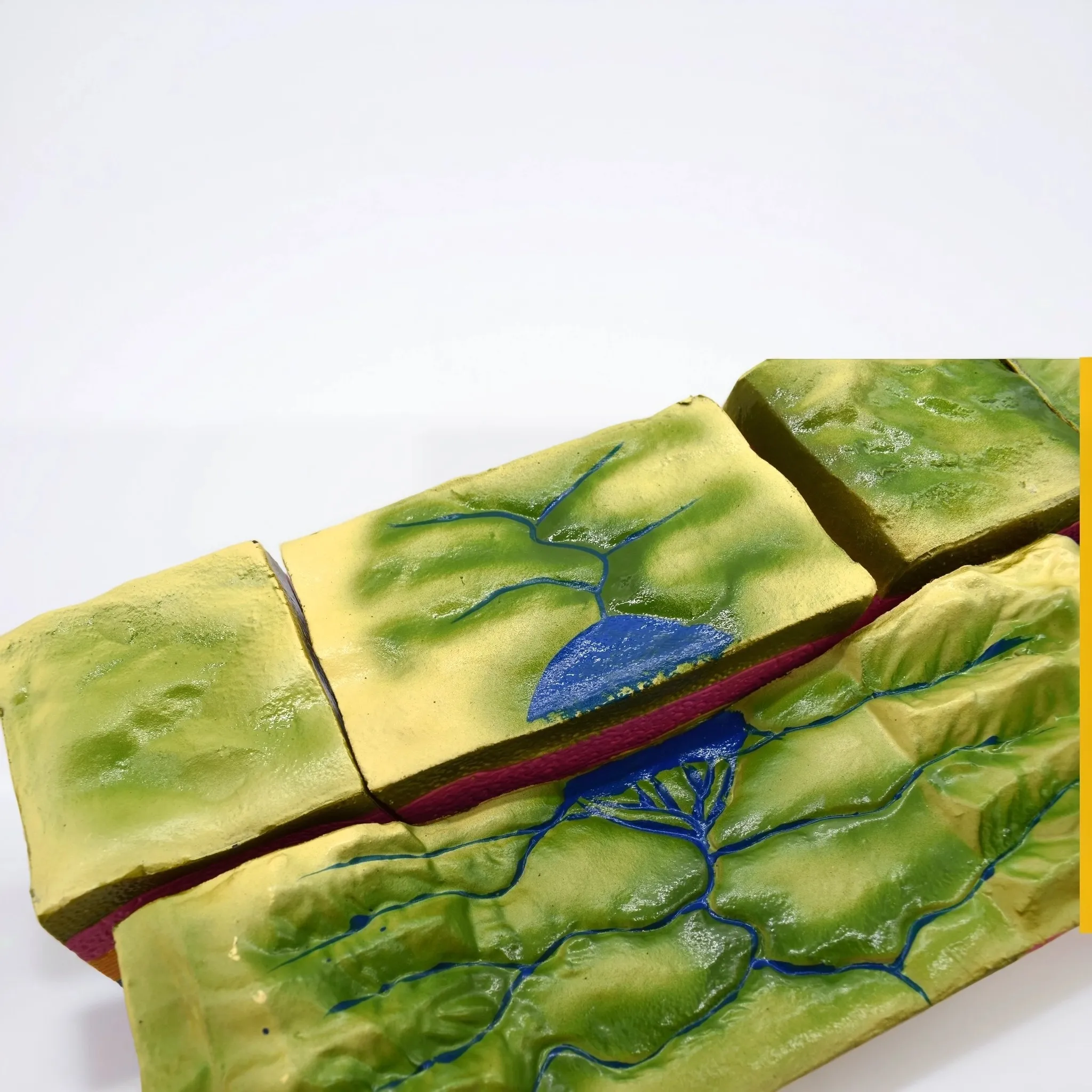 Модель изготовлена из ударопрочного износостойкого пластика и окрашена в естественные цвета, имитирующие различные слои почвы и горных пород. Разборная конструкция обеспечивает вариативность обучения:- Статическая часть: Демонстрирует участок земной коры с уже сформированным в результате сдвигов рельефом.