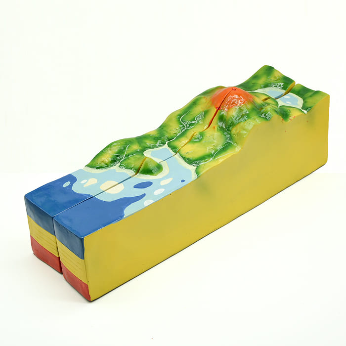 Предназначена для использования в качестве демонстрационного материала в курсе географии. Модель разборная, состоит из 2 частей, соединяющихся между собой с помощью штырьков. Модель изготовлена из пластмассы, раскрашена в естественные цвета. На разрезе, проходящем через центр вулкана, показаны магма, жерло вулкана, кратер, лава, побочные кратеры. Показано изменение поверхности Земли в результате вулканической деятельности.