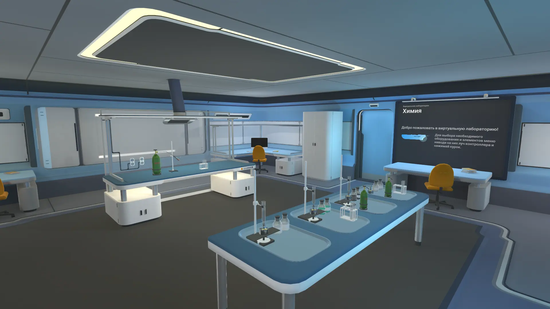 - Виртуальная операционная среда: высокоточное трехмерное пространство с возможностью выбора лабораторной посуды, приборов и химических реагентов.