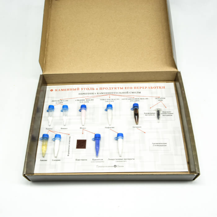 Образцы продуктов переработки (перегонки) каменного угля и изделий на основе каменноугольной смолы представлены в виде имитации в полипропиленовых пробирках, а также некоторые образцы изображены схематично в виде рисунка, цветного изображения и текста.