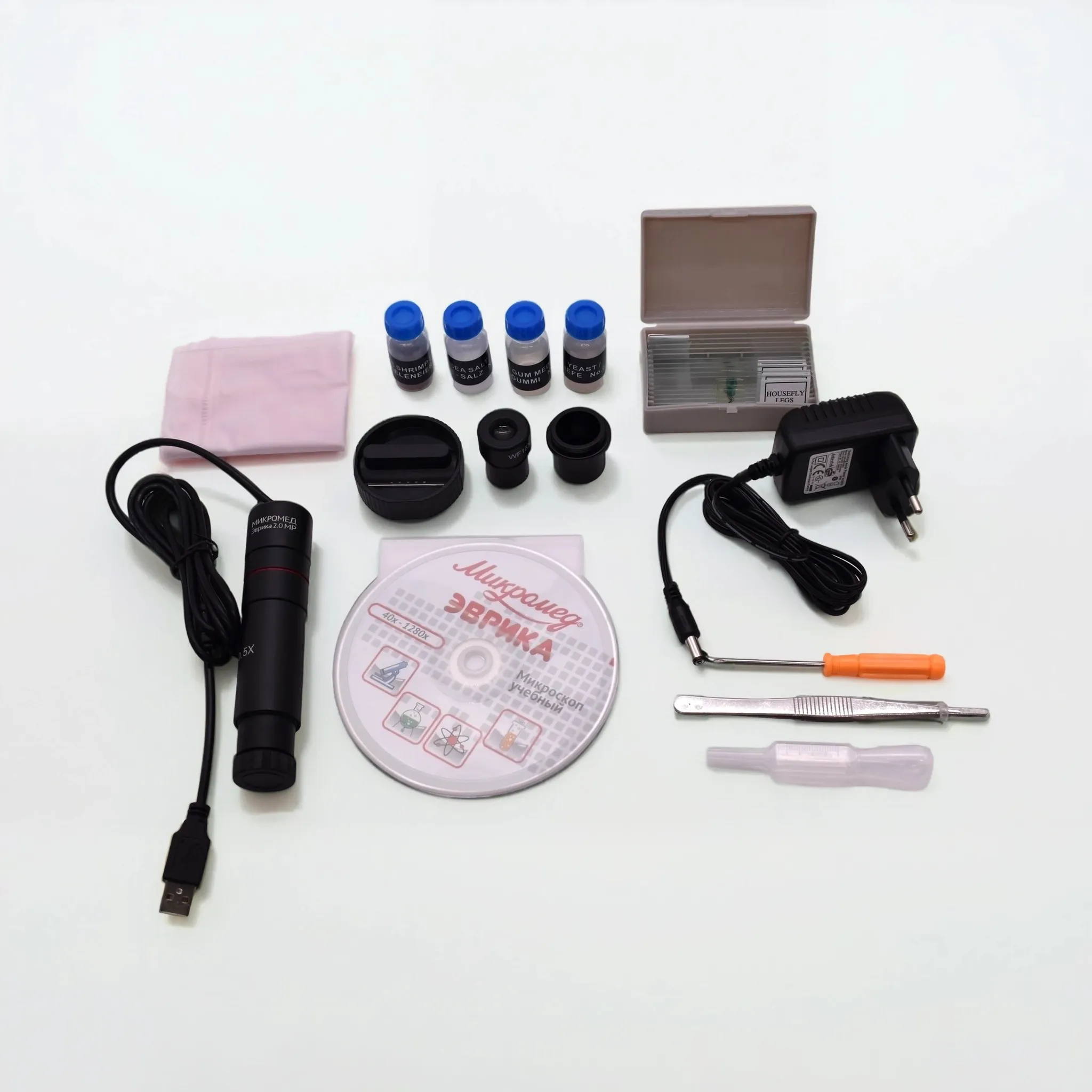 Микроскоп поставляется в кейсе, удобном для переноски. В комплекте с микроскопом - маленькая микролаборатория для самостоятельного изготовления препаратов.