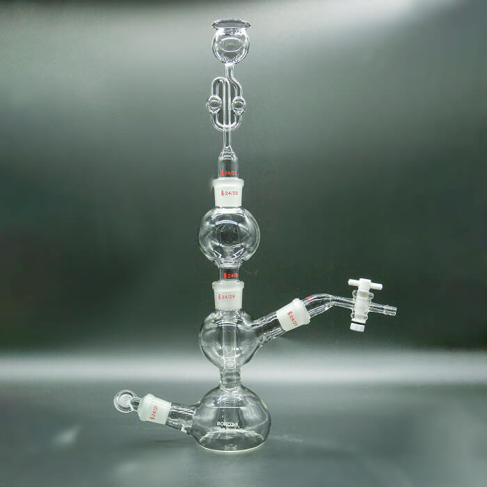 Универсальный прибор для получения газов действием растворов кислот и щелочей на твёрдые вещества. Устройство аппарата Киппа: колба-реактор имеет верхнюю шарообразную часть с тубусом, в которую вставляется газоотводная трубка, снабженная краном, и нижний резервуар в виде полусферы. Нижний резервуар имеет тубус, закрытый пробкой: он необходим для слива жидкости после использования прибора. Все соединительные части прибора - на шлифах.