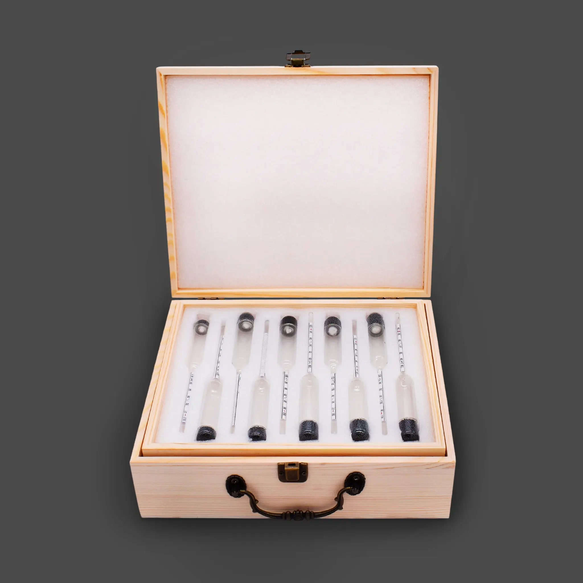 - Надежность хранения: Ареометры поставляются в премиальном деревянном боксе с внутренним ложементом из вспененного полимера и дополнительными деревянными подложками. Это гарантирует сохранность хрупких стеклянных приборов при транспортировке и длительном хранении в лаборантской.