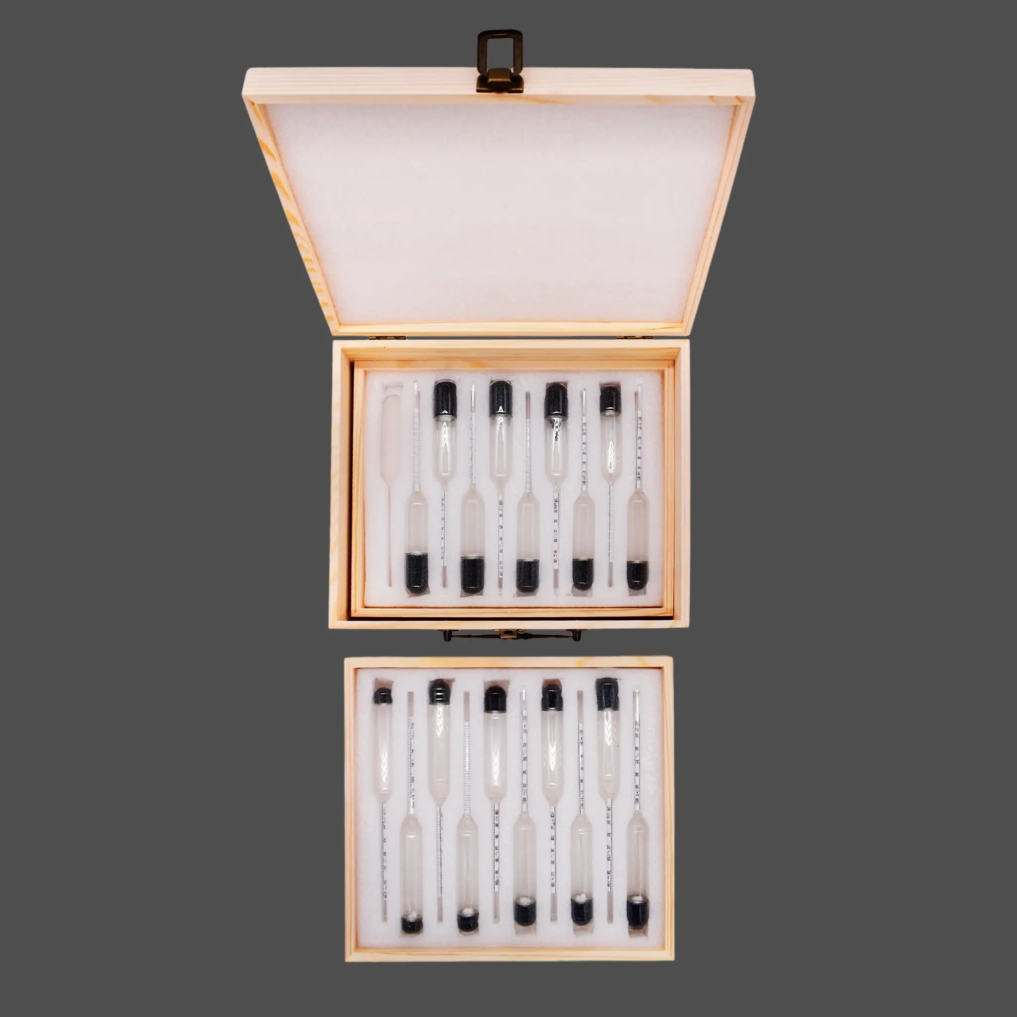 Ареометры выполнены из стекла, упакованы в ложемент из вспененного пластика, в 2 деревянные подложки и деревянный бокс.
