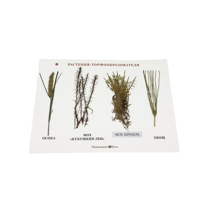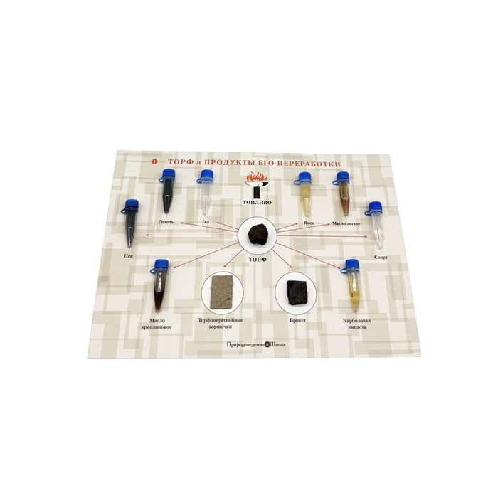Коллекция демонстрационная, состоит из 2-х планшетов, покрытых ламинирующей пленкой. Жидкие и мягкие продукты переработки торфа помещены в пробирки, вредные или ядовитые вещества в них имитированы. Растения-торфообразователи - натуральные.