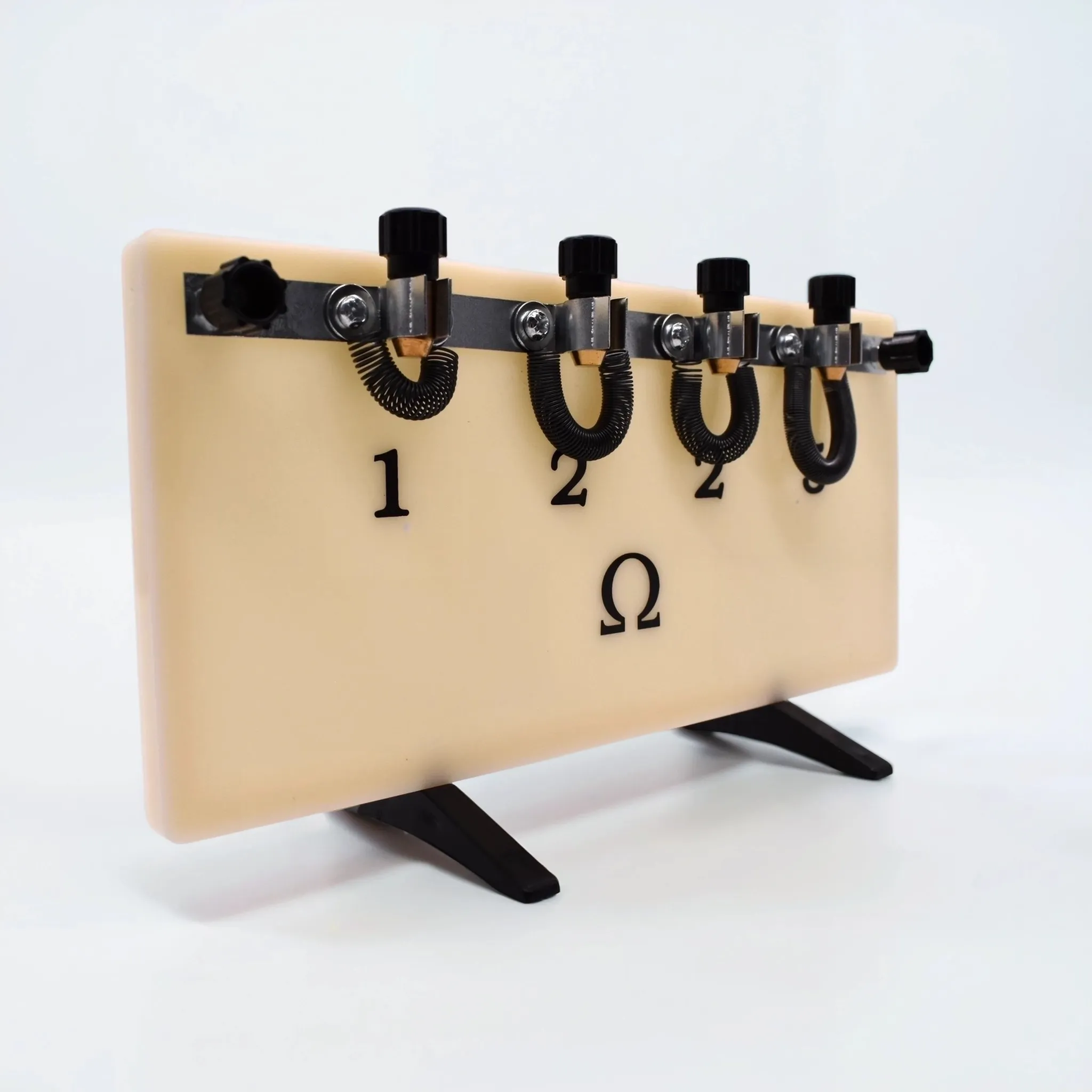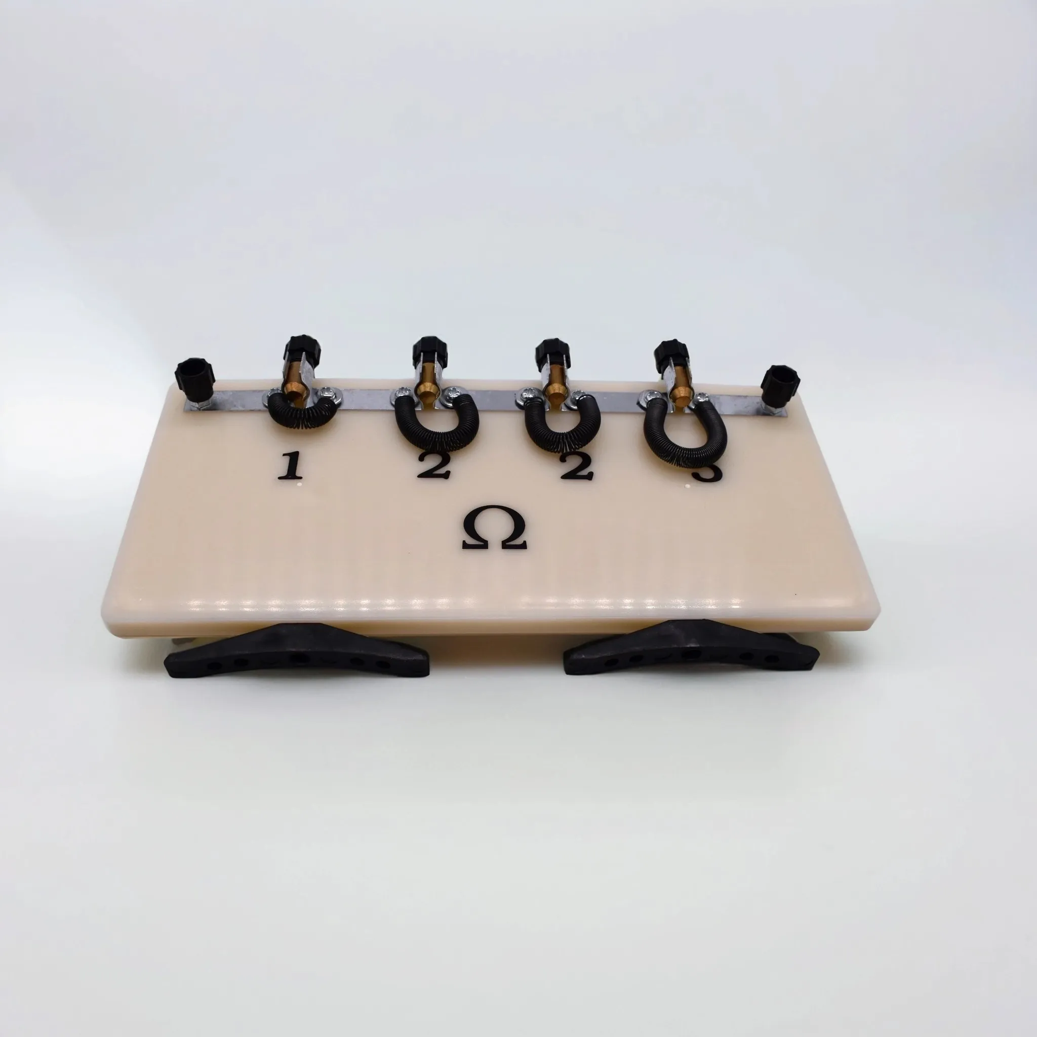 2. Проволочные сопротивления в виде спиралей из константановой проволоки — подключены к каждой паре соседних скоб, номиналы обозначены на панели.